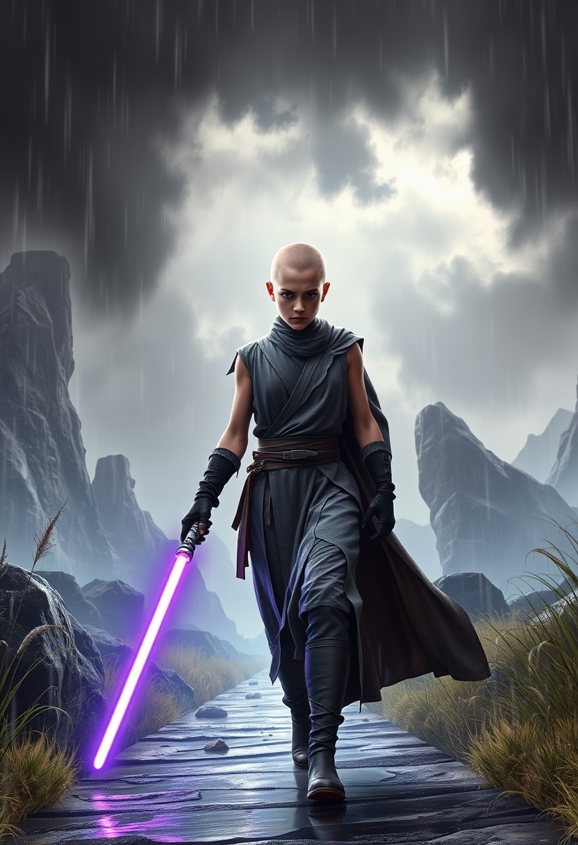 a centered below shot high detailed digital art illustration of a jedi knight in a walking pose holding with 2 purple light-sabers, wearing grey ripped dirty jedi tunic dripping with no sleeves and bare-arms, looking at viewer with angry face, bald young girl, black gloves. volumetric light from above, rim lighting, the background is a foreign planet with giant rocks, high grass in the wind, rain, storm, rainy day with dark clouds