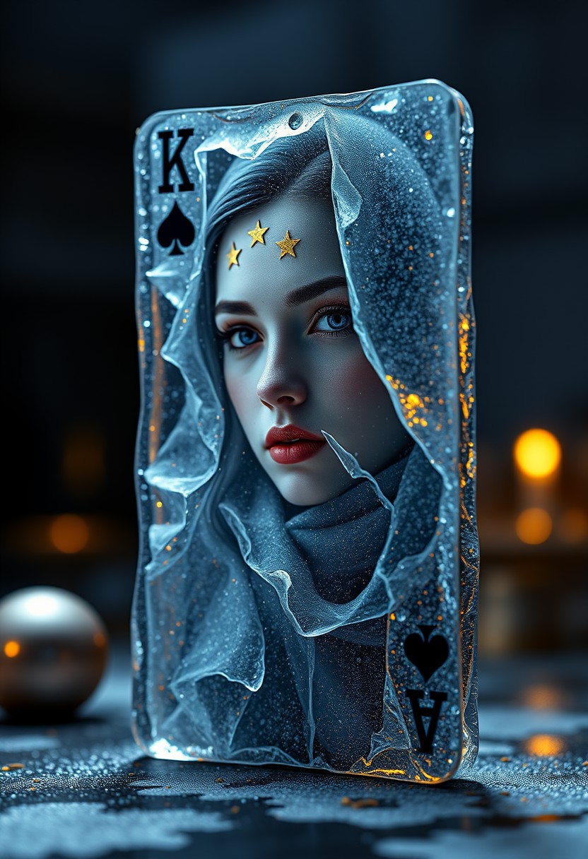 masterpiece, 8k, hdr, best quality, photography, analog style, real life, extremely beautiful, (highly detailed, intricately detailed), ray tracing, (dramatic lighting), a ice playing card with face a girl, in the style of ingrid baars, digital art techniques, alessio albi, caras ionut, dark gray and gold, wallpaper, 8k 3d