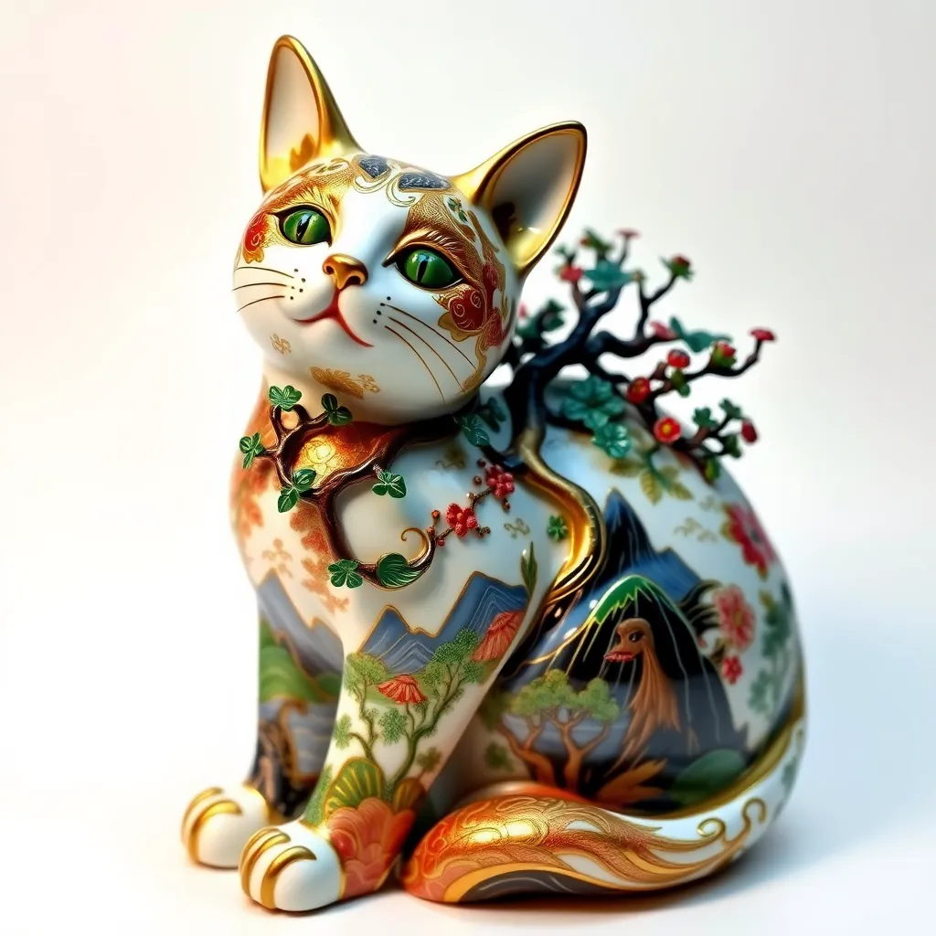 A sculpture of a cat, intricately designed with gold, red, green, blue, black and white patterns reminiscent of porcelain. The figure appears to be in harmony with the nature, with tree branches and foliage emerging from the cat's body. The patterns on the cat form depict landscapes, including mountains, water, and flora. The sculpture is placed against a white background, emphasizing its details and vibrant colors.