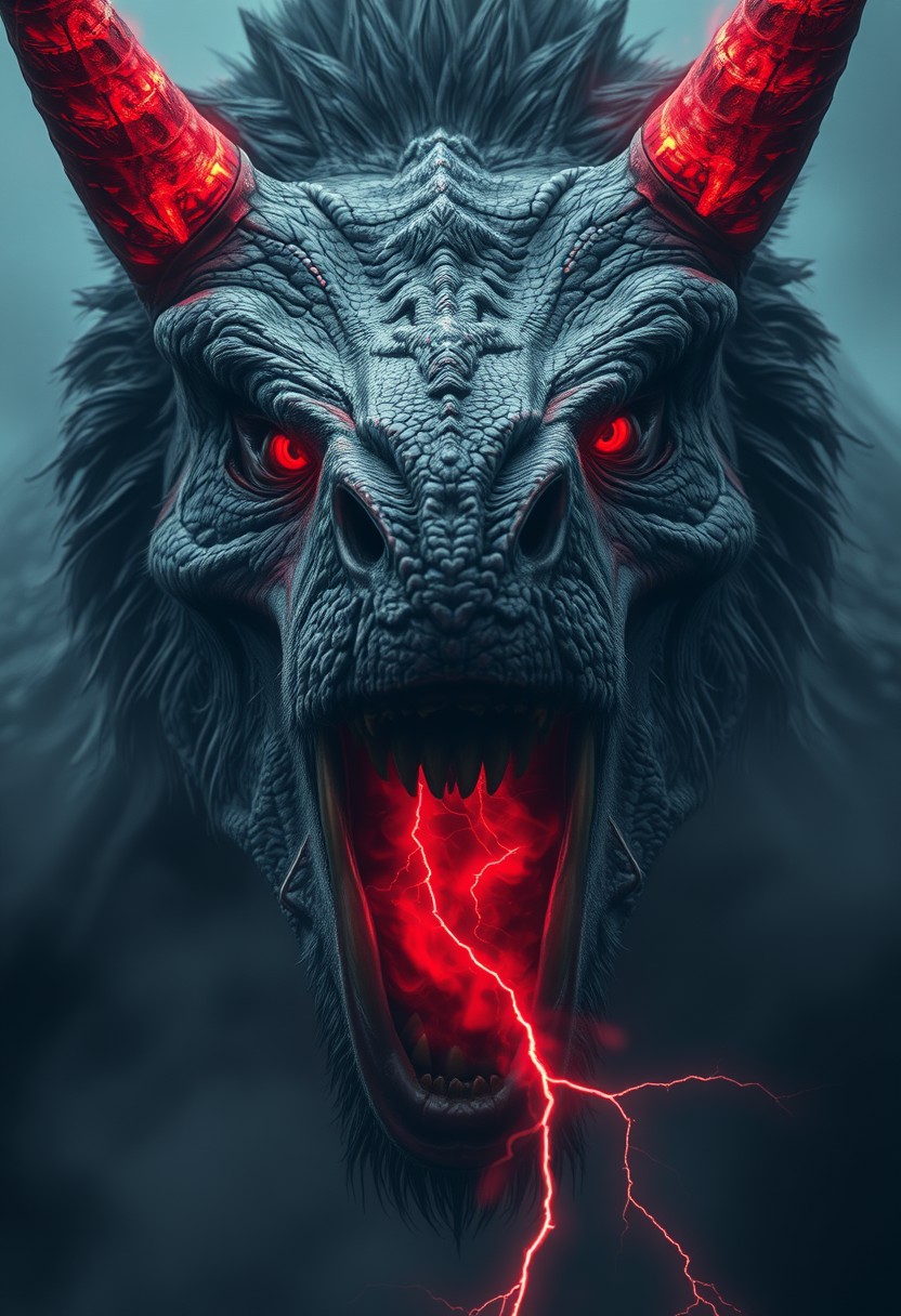 beast man face, fierce, agressive, HDR, 4k, ultra realistic, ultra detailed, in the mist, mastodonte, mammut, red smoke, lightnings