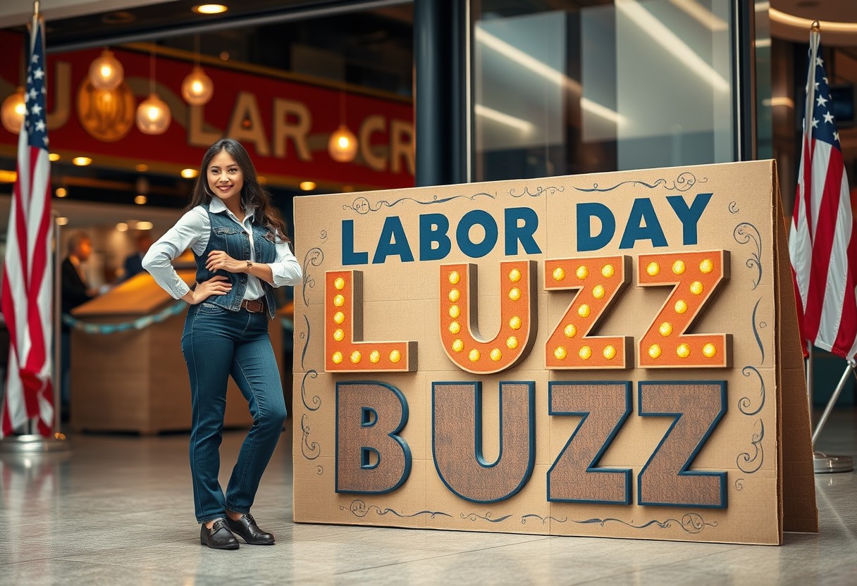 Get ready for an unparalleled Labor Day celebration, where your hard work is recognized with extraordinary rewards. Picture a dynamic scene with a confident female worker standing proudly beside a striking cardboard display titled ‘Labor Day Buzz.’ The sign, adorned with intricate designs and vibrant colors, symbolizes the spirit of the day and the power of labor. The worker, dressed in professional attire, embodies the strength and dedication of all who contribute to our world. As you step into this vibrant atmosphere, you’ll discover exclusive surprises and luxurious offers crafted just for you. Whether you’re looking to unwind or indulge, our top-tier rewards will elevate your Labor Day experience. Celebrate your achievements in style – because this day is a tribute to the labor that drives progress