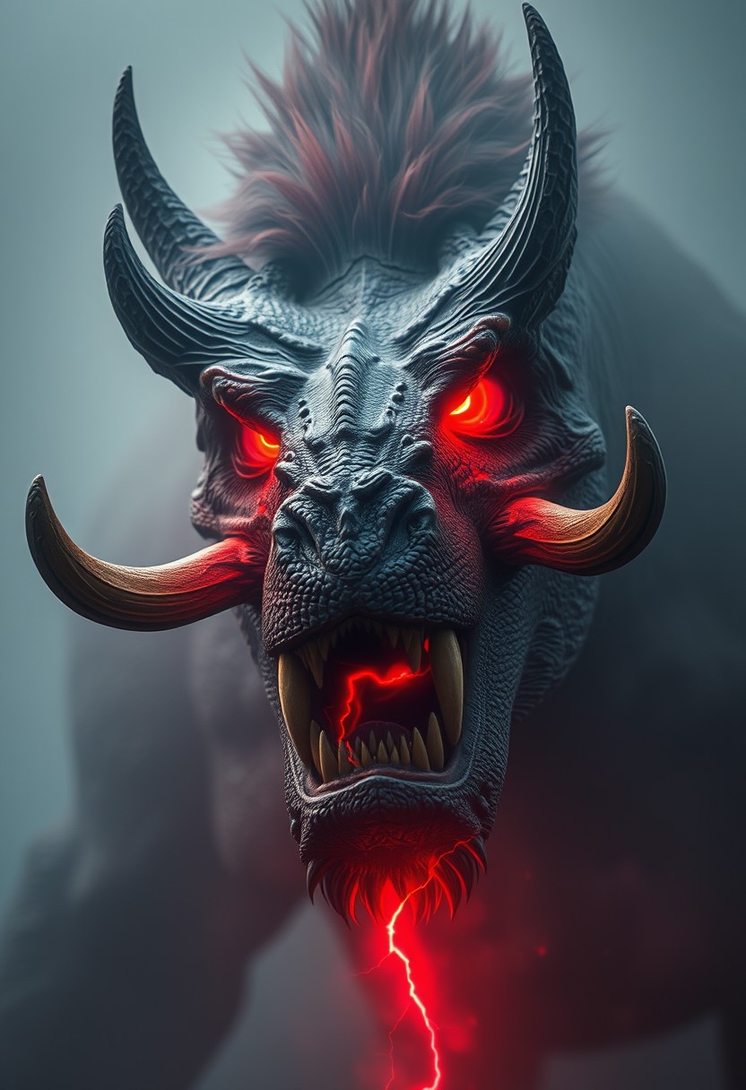 beast man face, fierce, agressive, HDR, 4k, ultra realistic, ultra detailed, in the mist, mastodonte, mammut, red smoke, lightnings
