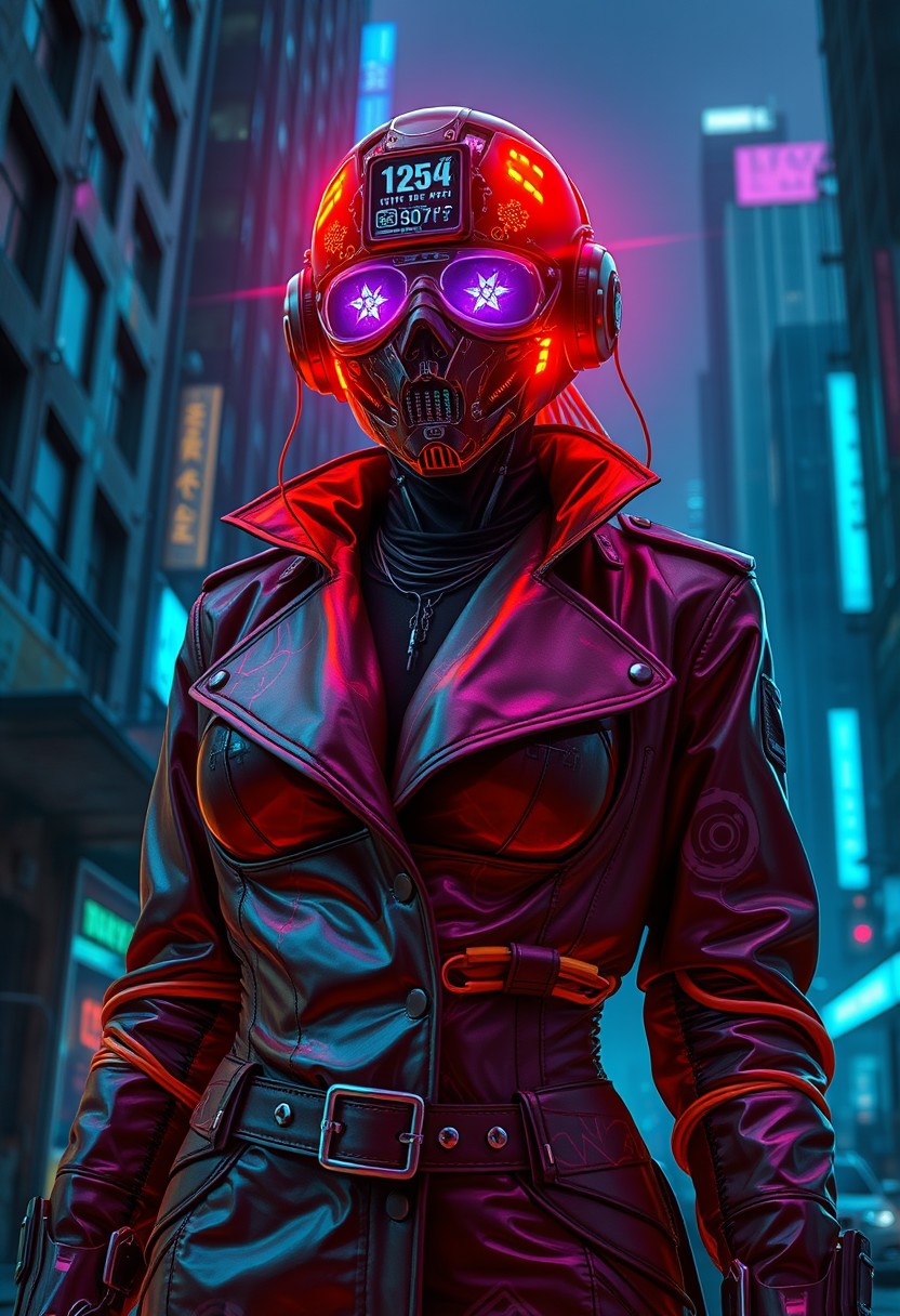 In a gritty dystopian cityscape, bathed in high-contrast neon hues, a cyberpunk plague girl stands tall, donning a futuristic exosuit that glistens with glowing seams. Her LED eyes gleam like stars amidst a holographic HUD within her mask, flickering with data streams. Beneath the mask, plasma streams dance like celestial bodies. The plague doctor's trench coat patterned with circuitry flows like dark space, punctuated by neural interface ports and augmented reality scanner lenses. Gigantic breasts and cleavage cutouts are accentuated by chrome accents that glint as data cables weave through her cyborg form, set against a backdrop of urban decay.