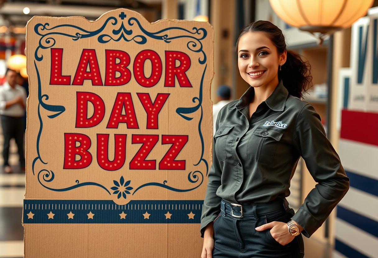 Get ready for an unparalleled Labor Day celebration, where your hard work is recognized with extraordinary rewards. Picture a dynamic scene with a confident female worker standing proudly beside a striking cardboard display titled ‘Labor Day Buzz.’ The sign, adorned with intricate designs and vibrant colors, symbolizes the spirit of the day and the power of labor. The worker, dressed in professional attire, embodies the strength and dedication of all who contribute to our world. As you step into this vibrant atmosphere, you’ll discover exclusive surprises and luxurious offers crafted just for you. Whether you’re looking to unwind or indulge, our top-tier rewards will elevate your Labor Day experience. Celebrate your achievements in style – because this day is a tribute to the labor that drives progress