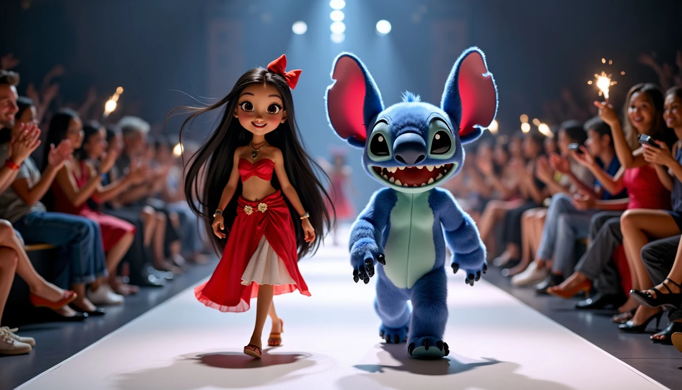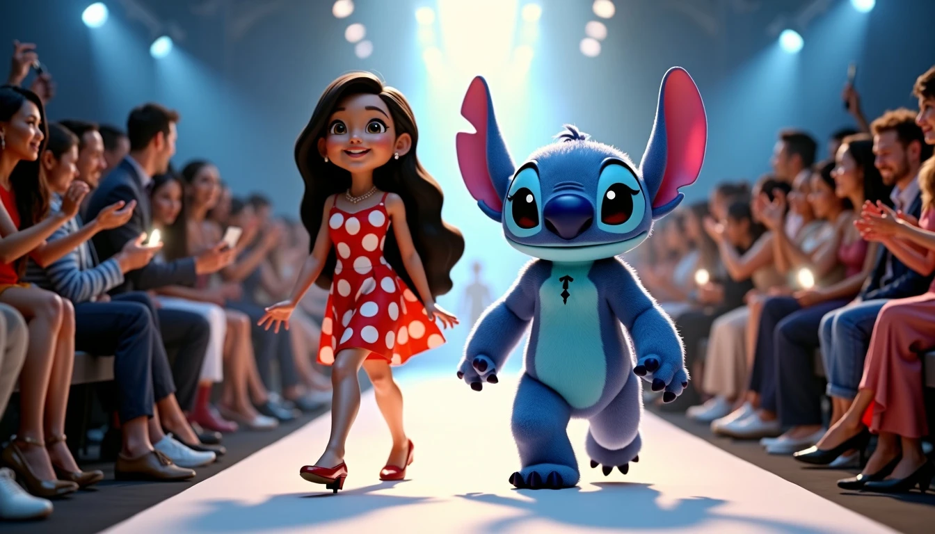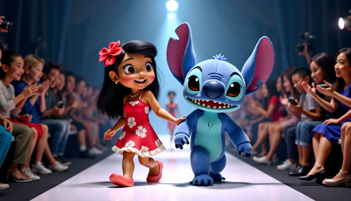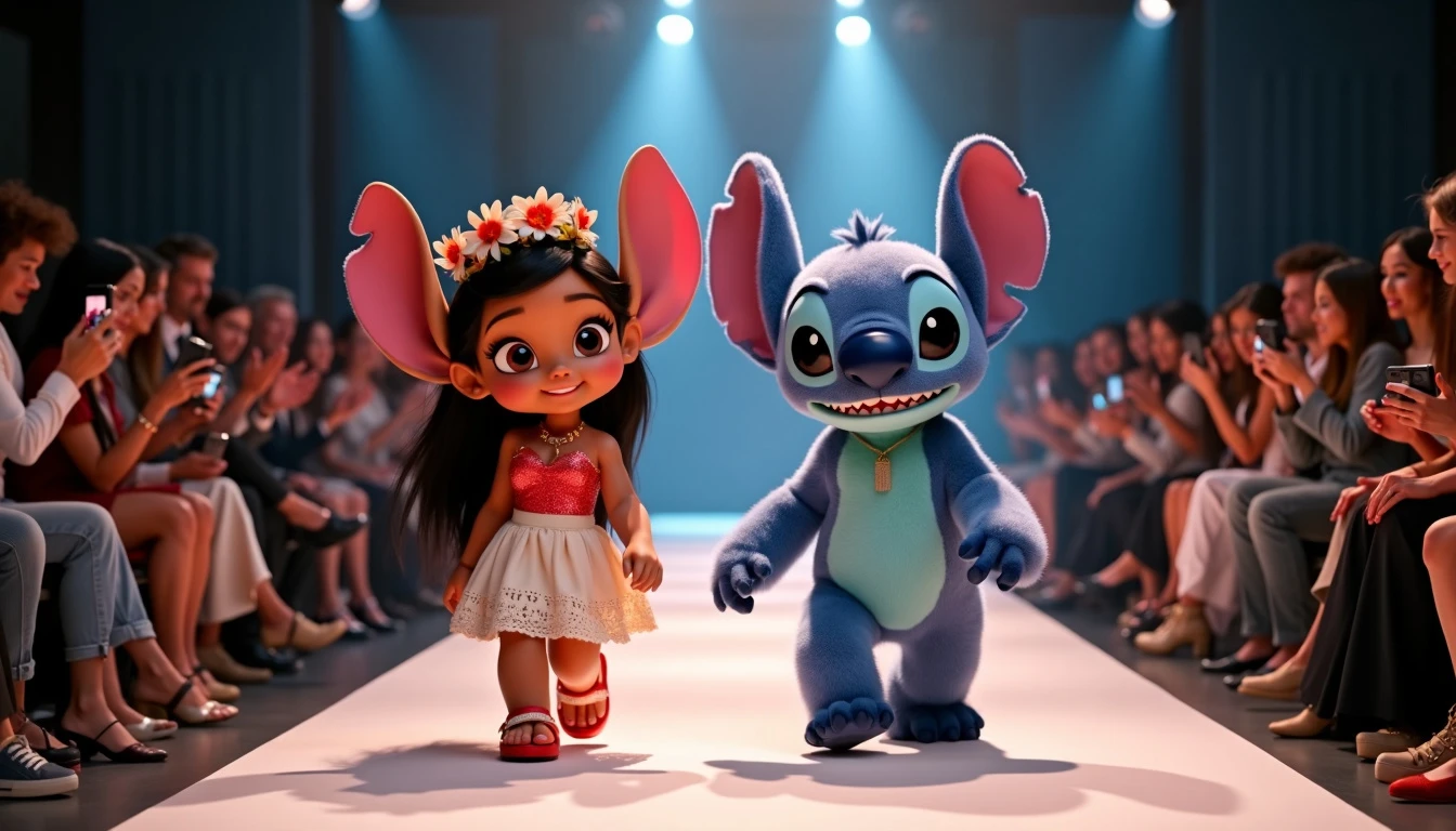 Lilo and Stitch as 3D fluffy characters are strutting down a high-fashion runway, dressed in stylish, trendy outfits. The wide-angle shot captures the entire chic, modern fashion show setup with a sleek runway stretching out in front of them. The audience is on both sides, cheering and clapping, while photographers are snapping pictures with flashing cameras. The bright spotlights focus on Lilo and Stitch as they confidently pose and walk, showcasing their unique styles.