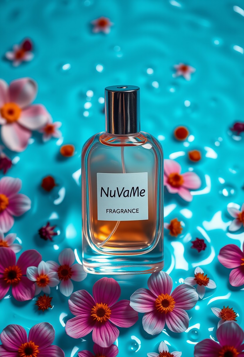 Minimal perfume bottle and flowers all over the set, top light on top of a background with water, saturation color scheme, bright light glass refraction, mottled shading, studio lighting, contrast high precision, fine gloss, centered composition, neon blue color palette. Brand name written as 'NuVaMe Fragrance' on it.