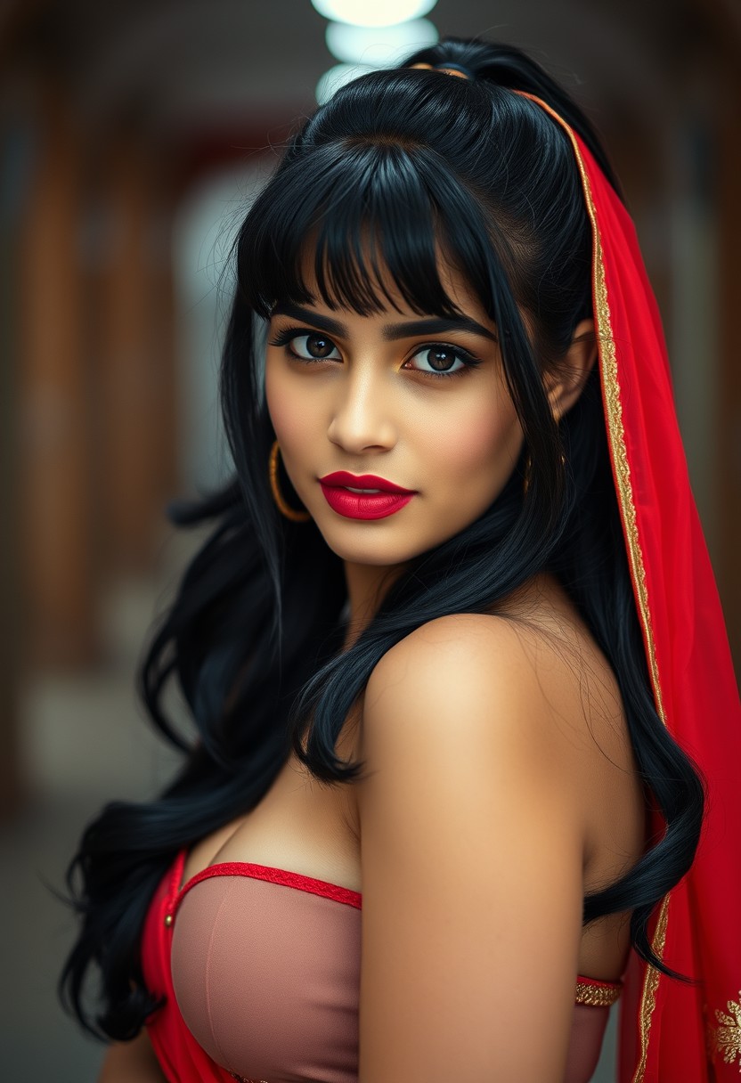 Shot using: Sony a7R IV, 35mm f/1.4 Zeiss Distagon lens, Fujicolor Pro 400H film, girl, punjabi, kajal choudhary,, looking at viewer, red dupata, ponytail, bangs, black hair, bangs large breasts, slim, puffy nipples. , pinup pose, portrait, cinematic hdr dof tilt shift bokeh