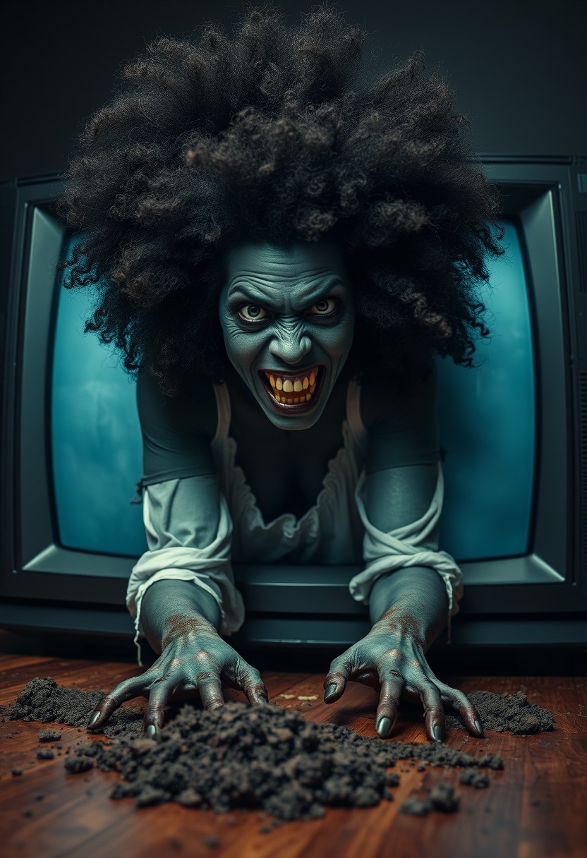Highest quality, (cinematic lighting:1.1), action movie film still, a bluish-green ((zombie)) skinned black woman with a wild Afro that frames her eyes, wide nose, thick lips, and face. She has an angry look with her teeth showing. She wears a ((dirty white)) tattered and ripped dress covered in ((((dirt and filth))). She emerges from inside of a cathode ray television set, crawling out from inside the screen. Shot from a distance, her hands and arms are crawling on the hard wood floor in front of the 55 inch floor model CRT television while her knee is crawling from inside the tv screen, dirt covers the floor in several small piles, facing viewer, highly detailed blemishes cover her zombie skin, the pitch black room is lit from the ambient light of the tv screen, photographed on RF 35mm lens, F2.8, HDR, 8k, highly detailed, Cinestill 800T, dynamic angle, inspired by the movie ((((The Ring)))).