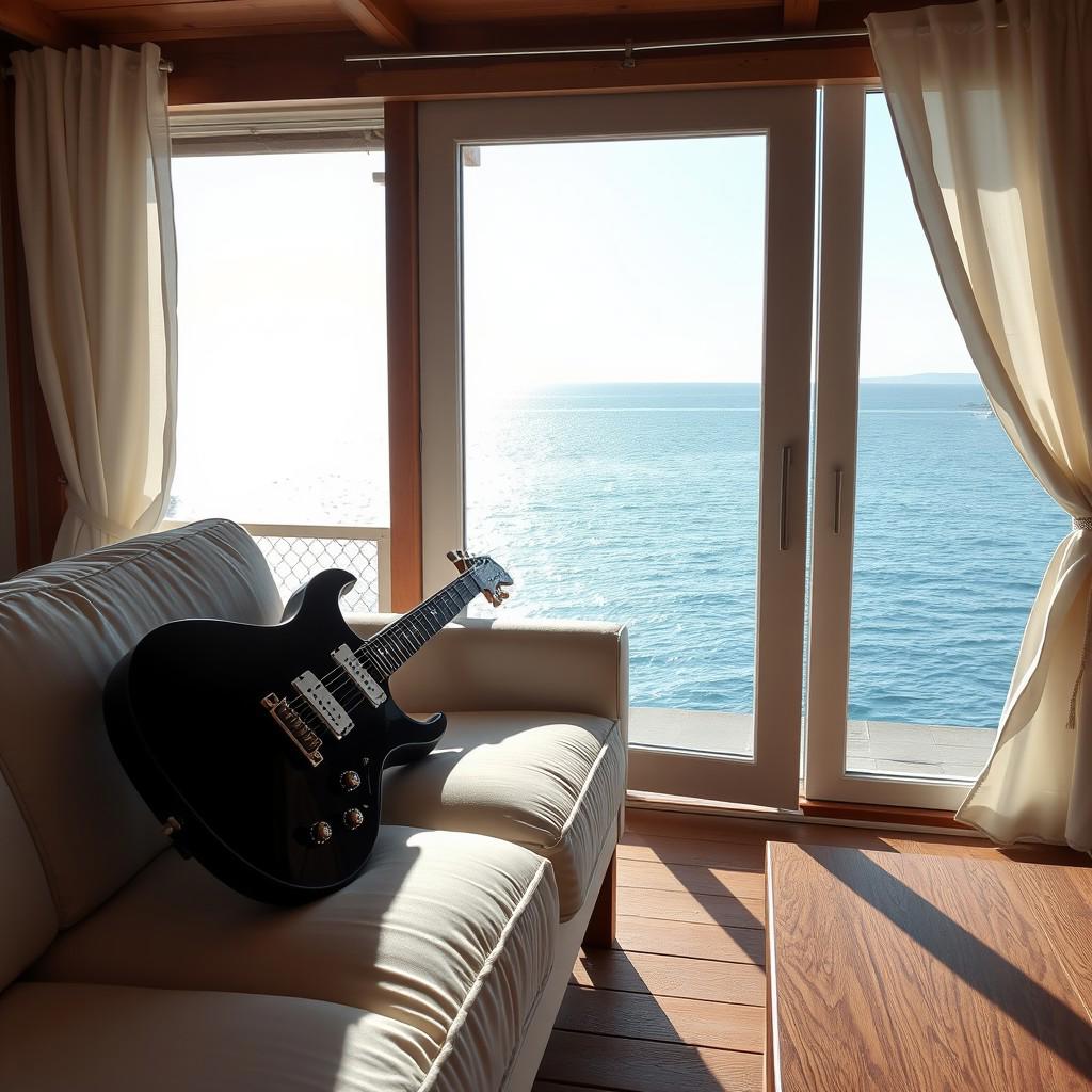 in the foreground, on the left side a shiny black peavey EVH resting on one of the arms of a silky white sofa on a woody and opened balcony. in the background, a large door with a silky white curtain overlooking a bay of blue waters and being rocked by a breeze. the water reflects a mid-afternoon sun.