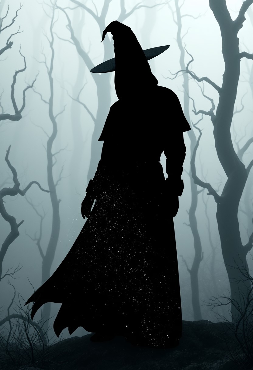 Best quality, masterpiece, 8k, high detalized, hyper-detailed, silhouette of a black magician on the edge of an ashen gray forest with twisted trees drowning in gray fog. A multitude of tiny shining specks of dust swirl around the silhouette. A feeling of fear and genuine horror. Fullbody, masterpiece
