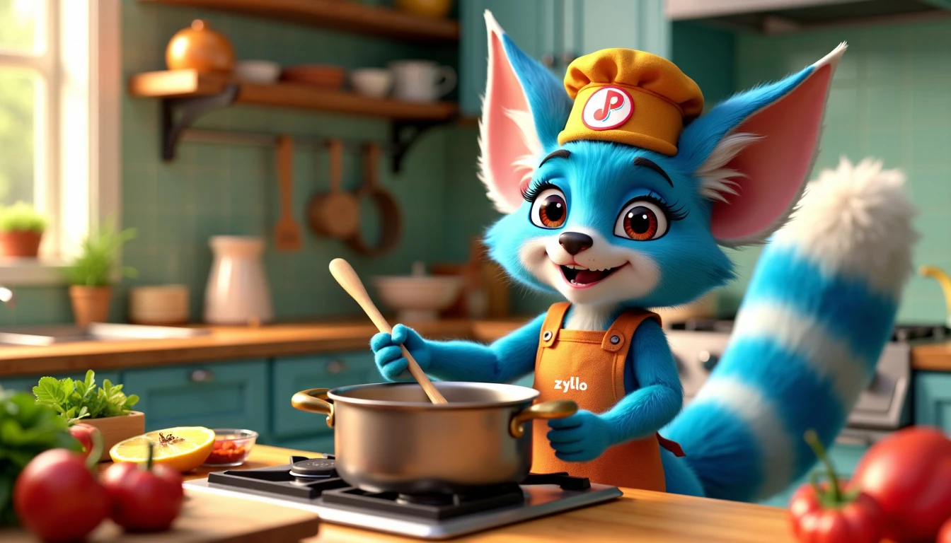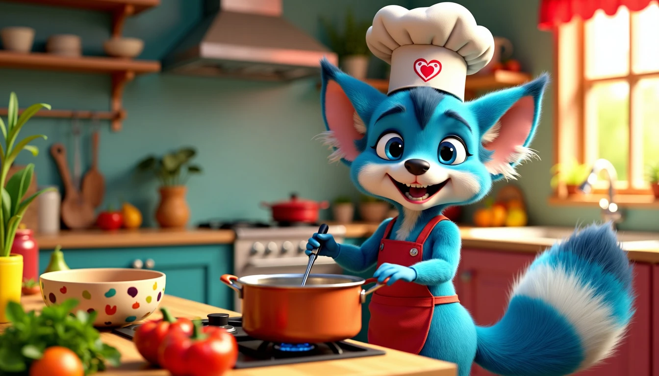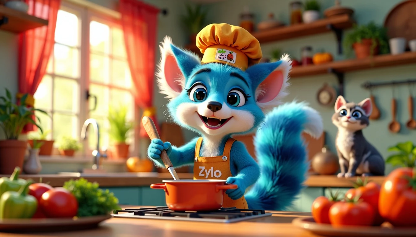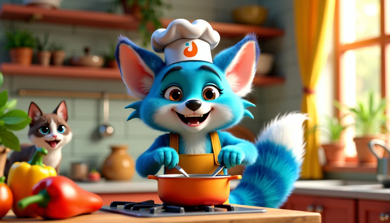 Create an image of Zylo, a whimsical character that is half fox no tail and half lemur no tail 3d urban cloathing, , his colour is bright blue , in a colorful kitchen. Zylo is wearing a chef's hat Tiktok logoand an apron, joyfully stirring a pot on the stove. The kitchen is filled with vibrant ingredients like vegetables, spices, and a playful cat watching curiously. Zylo has a big smile, showcasing his playful personality, with his fox ears perked up and lemur tail curled around a kitchen stool. All ultra realistic