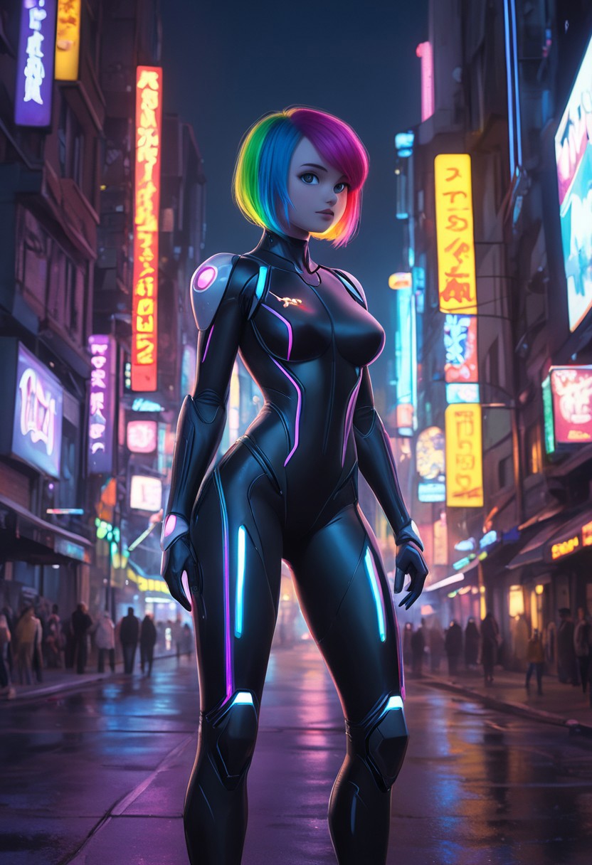 (disney pixar style:1.2) (cute adorable girl:1.15) (adult age 20:1.15) short rainbow hair, future bodysuit with led lights, sexy revealing outfit, cybersuit, large breasts, cleavage, standing outside at night, on the cyberpunk city streets (extreme far shot, full body, zoomed out:1.1)