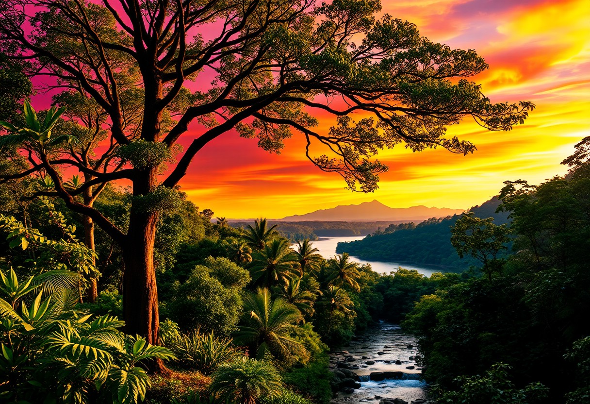 A stunning vista of a lush, untouched tropical rainforest, bathed in the warm, golden light of the setting sun. The sky above is a vivid mix of crimson, orange, and yellow hues, with a few wispy clouds dotting the horizon. In the foreground, a towering tree, adorned with vibrant green leaves and a canopy of delicate, intricate branches, stands tall, its trunk disappearing into the dense undergrowth. A small stream, glistening with reflected light, meanders through the frame, its crystal-clear water cascading over smooth rocks and creating a soothing soundtrack for the scene. Directly behind the tree, the forest gives way to a picturesque river, its glassy surface reflecting the vibrant colors of the sky and the surrounding vegetation. In the distance, a hazy mountain range rises up from the horizon, its peaks shrouded in wispy clouds, their jagged outlines contrasting beautifully with the serene, idyllic landscape before them. This award-winning nature photograph perfectly captures the breathtaking beauty and fragile balance of life in a tropical rainforest ecosystem.