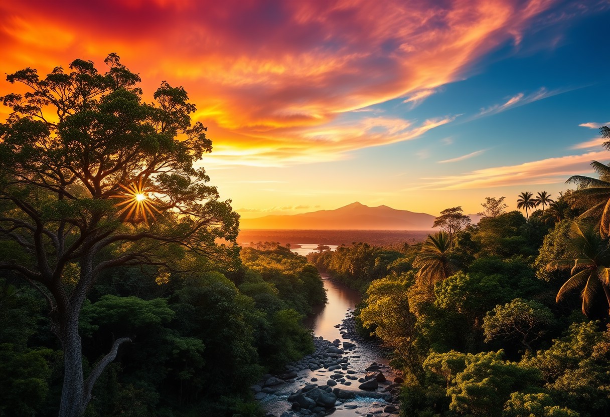 A stunning vista of a lush, untouched tropical rainforest, bathed in the warm, golden light of the setting sun. The sky above is a vivid mix of crimson, orange, and yellow hues, with a few wispy clouds dotting the horizon. In the foreground, a towering tree, adorned with vibrant green leaves and a canopy of delicate, intricate branches, stands tall, its trunk disappearing into the dense undergrowth. A small stream, glistening with reflected light, meanders through the frame, its crystal-clear water cascading over smooth rocks and creating a soothing soundtrack for the scene. Directly behind the tree, the forest gives way to a picturesque river, its glassy surface reflecting the vibrant colors of the sky and the surrounding vegetation. In the distance, a hazy mountain range rises up from the horizon, its peaks shrouded in wispy clouds, their jagged outlines contrasting beautifully with the serene, idyllic landscape before them. This award-winning nature photograph perfectly captures the breathtaking beauty and fragile balance of life in a tropical rainforest ecosystem.