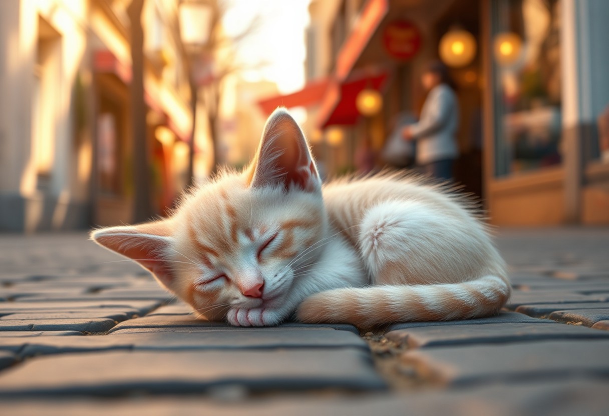 Pixar inspired poster, A perfect masterpiece art by pixar disney, Digital painting of a cute young pinkish kitten curled sleeping on the ground, paved street, close up, basking in the morning sun, cute cozy atmosphere, shops can be seen in the background, magical fantasy city, life-like masterpiece realitic photo, hyper realistic, A photogenic soft scene, digital 4k art, bokeh, depth of field, detailed eyes, 4K, vivid, extremely detailed, perfect anatomy, maximalist, dynamic, absurdres, 8k photography, three point perspective, Ultra-realistic, Hyperrealism