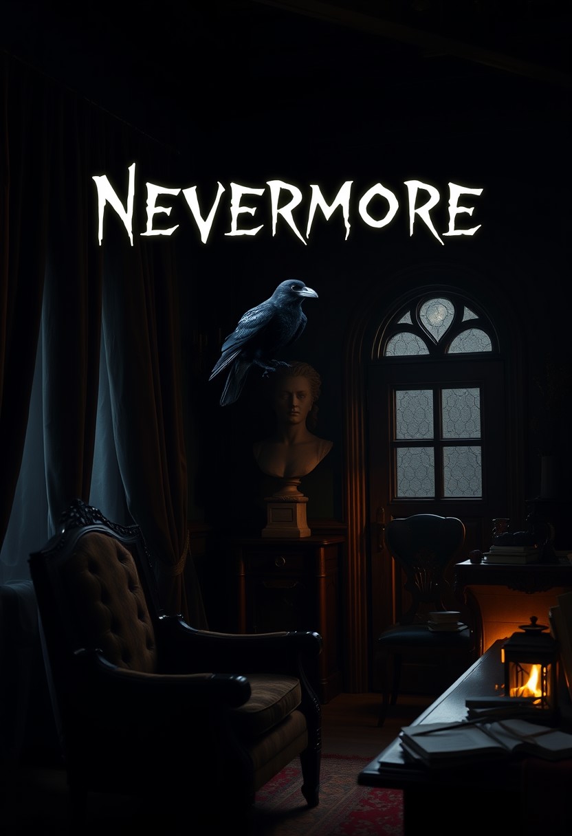 A dimly lit, gothic study room with dark, rich wooden furniture and heavy, velvety curtains that allow more moonlight to seep through, slightly brightening the scene. In the foreground, a large, ornate armchair sits beside a flickering fireplace, casting dancing shadows across the room. Perched ominously atop a bust of Pallas above the chamber door is a large, jet-black raven, its feathers glistening in the faint light. The raven’s eyes are sharp and piercing, glowing with an eerie, otherworldly intensity. The room, though dark, has just enough light to reveal the intricate details of scattered books, quills, and parchment papers strewn across a dark mahogany desk. Above the raven, floating in the air in the iconic, jagged font from the movie *Psycho*, are the words "NEVERMORE," glowing with a faint, spectral light. The text adds a sense of psychological tension and unease, perfectly complementing the scene's atmosphere of mel