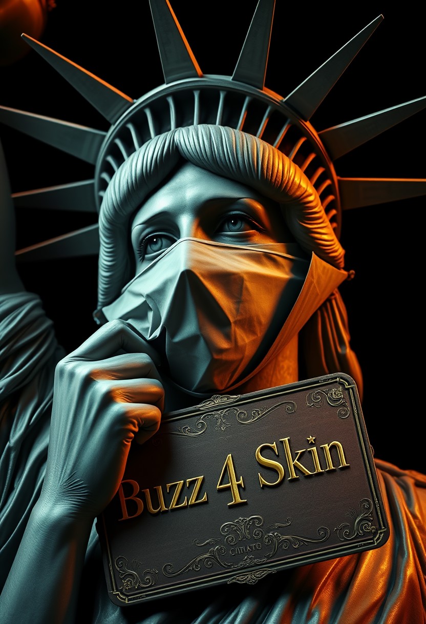 **Prompt:** A highly detailed and dramatic portrait of the Statue of Liberty, focusing on her face in a macro close-up. The Statue of Liberty is unwrapping a large, non-surgical face mask, revealing the intricate and realistic facial muscle structure beneath. The mask is partially peeled away, exposing tendons, muscles, and sinews in high detail. Around her neck, a luxurious and ornate cardboard sign hangs with the text "Buzz 4 Skin" elegantly embossed in gold lettering. The cardboard is richly decorated with intricate patterns and gilded edges, giving it an unexpectedly opulent appearance. The scene is lit with dramatic studio lighting, casting deep shadows and emphasizing the contrast between the statue's iconic metal surface and the raw, exposed anatomy. The overall atmosphere is dark and unsettling, with a creepy, almost dystopian vibe that contrasts sharply with the rich, decorative sign.