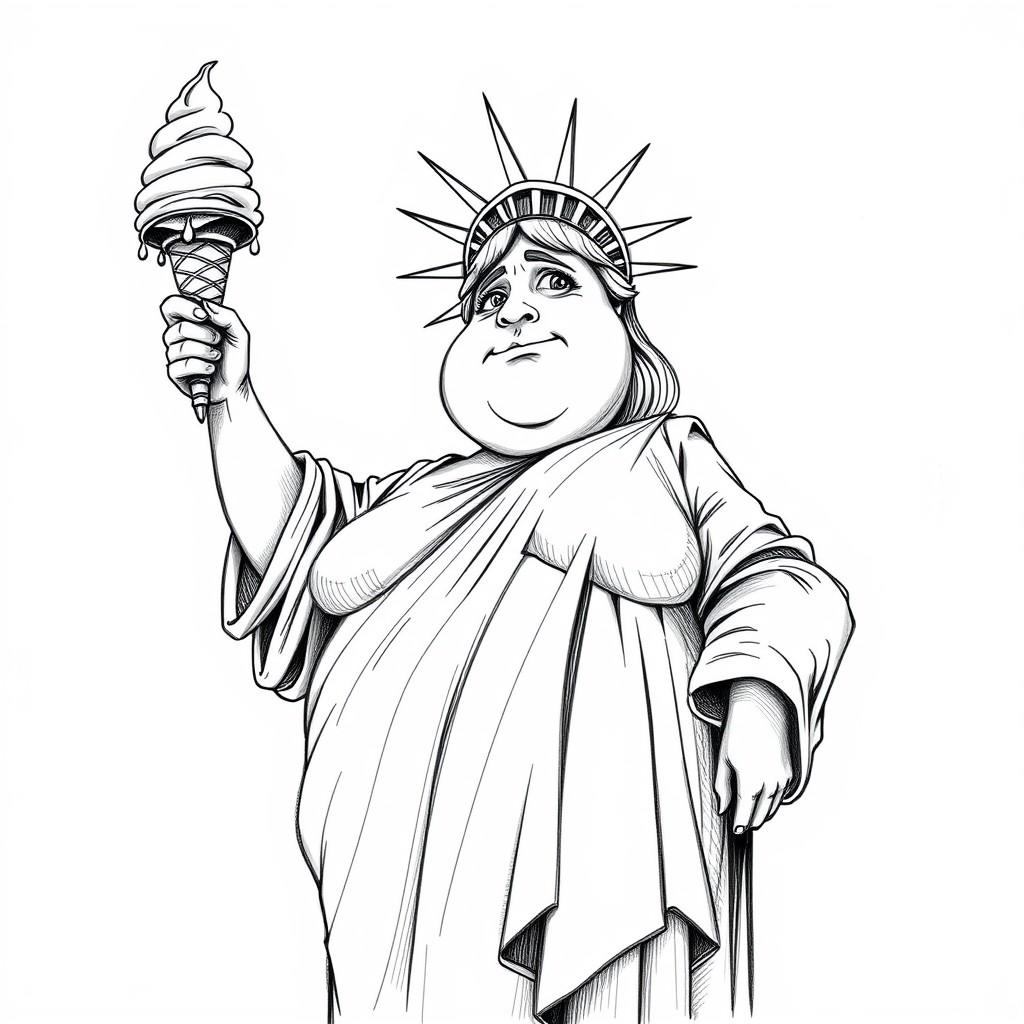 A humorous black pencil sketch of the Statue of Liberty, depicted as noticeably overweight, holding a giant melting ice cream cone instead of her usual torch. Viewed from a low angle, emphasizing her imposing yet comical figure against a blank background. The statue has a slightly embarrassed yet satisfied expression, with raised eyebrows and a sheepish smile. Her eyes dart to the side, as if caught in the act. The ice cream is a towering, multi-scoop monstrosity, teetering precariously and dripping down her arm. The crown is slightly askew on her head, adding to the disheveled appearance. Her robe stretches tight across her expanded midsection, with exaggerated folds and creases. The pencil strokes are loose and expressive, with heavier lines emphasizing key features and lighter, sketchier lines adding texture and movement. Shading is done with cross-hatching, particularly around the ice cream to show its melting state. The sketch's style is reminiscent of political cartoons, with exaggerated features and a clear message. The overall mood is lighthearted and ironic, inviting viewers to chuckle while also contemplating the underlying message about freedom and choices. Lighting in the sketch comes from the upper left, casting shadows that add depth and emphasize the statue's round form. This lighting also highlights the drips of ice cream, drawing attention to the 'indulgence' aspect of the image
