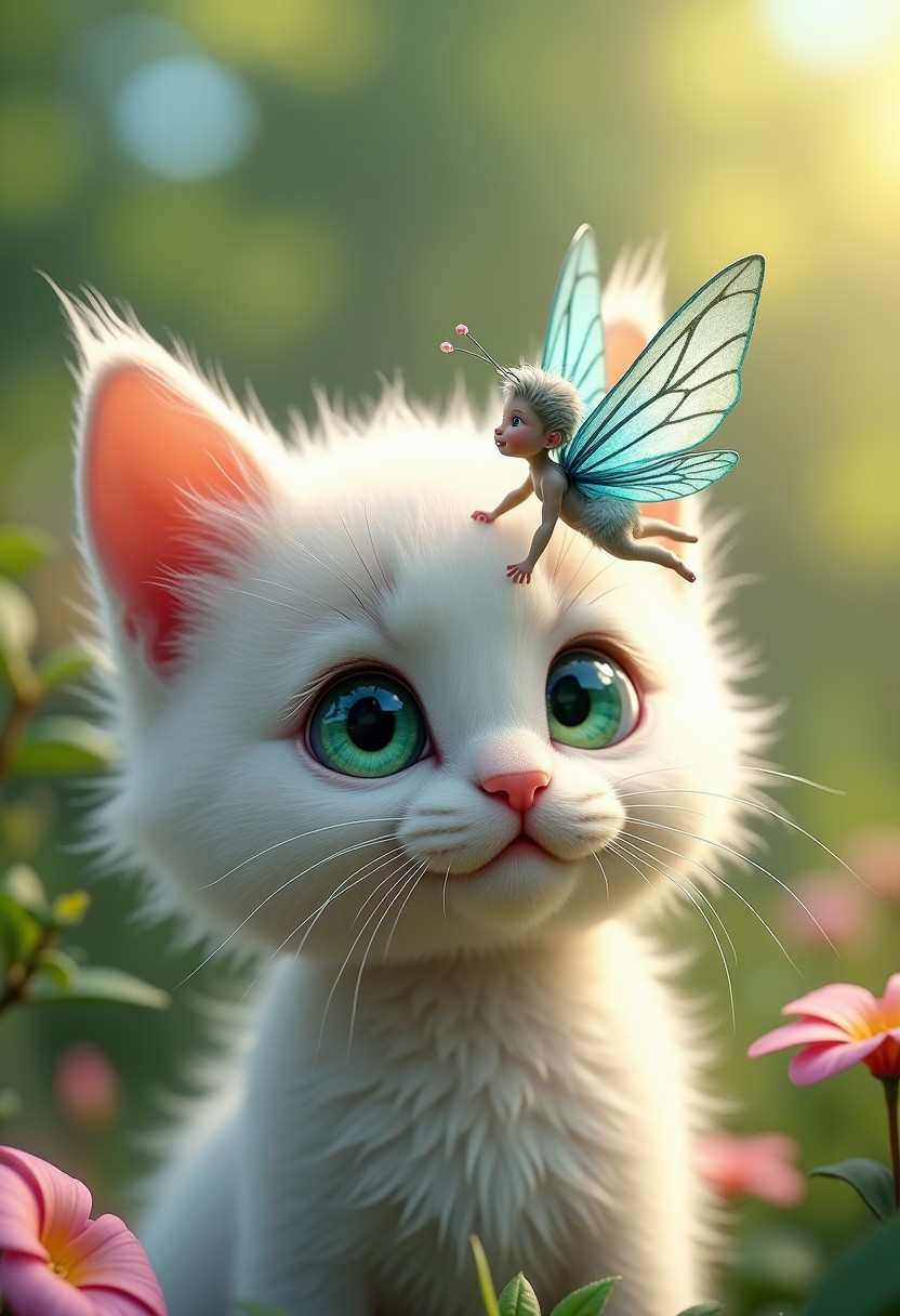 A detailed close-up of Whiskers, a fluffy white kitten, with a beautiful, humanlike fairy perched delicately on his nose. The fairy has iridescent wings that shimmer in shades of blue, glowing softly in the sunlight. Her delicate features and graceful form add a touch of magic to the scene. Whiskers' emerald green eyes are wide with wonder, reflecting the enchanting presence of the fairy. The lush garden background is vibrant, filled with blooming flowers and soft sunlight filtering through the leaves. The scene is rendered in high-definition 3D animation, capturing every whisker and the fairy’s delicate movements with stunning clarity.