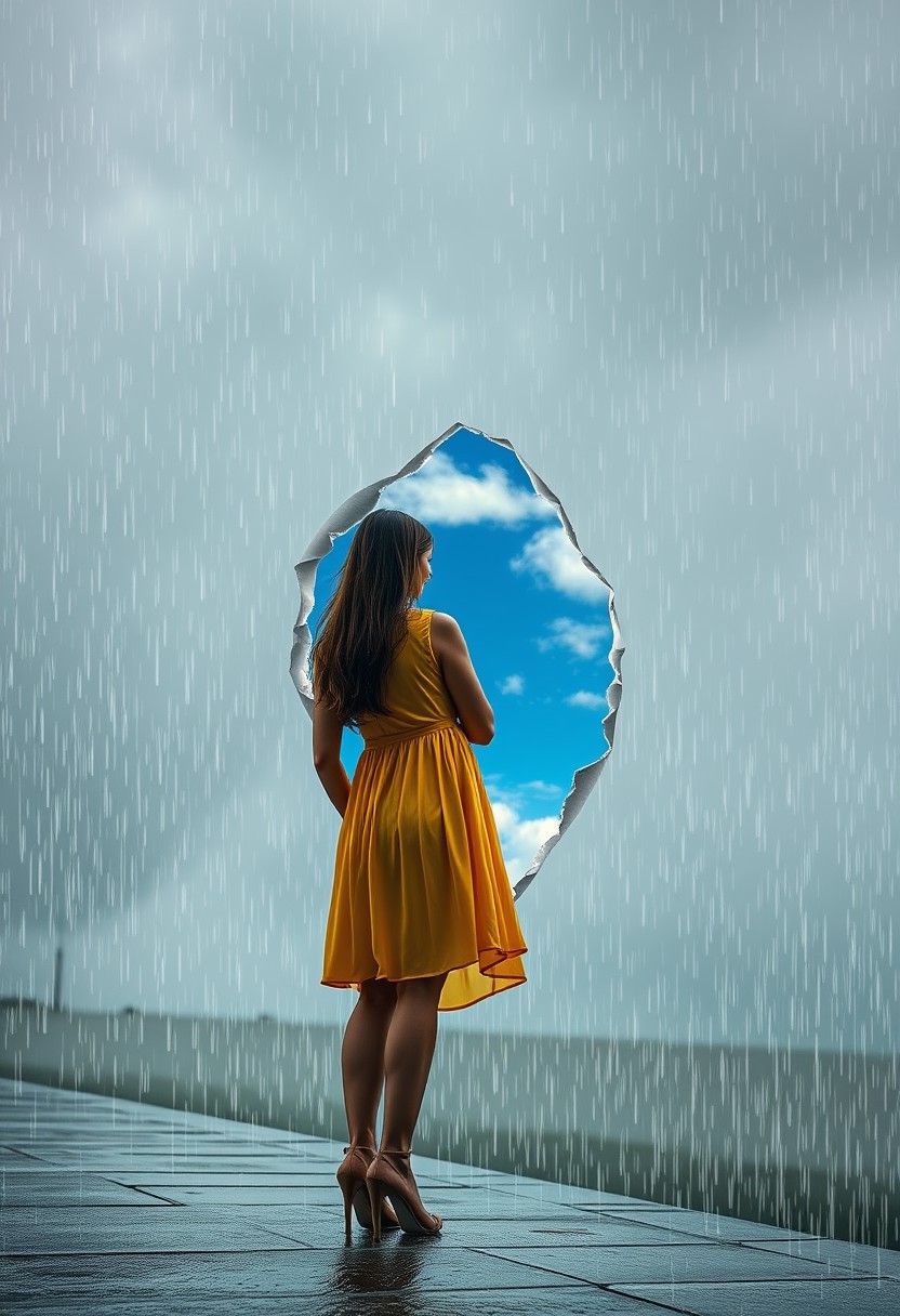 artistic photoshop montage representing a scene outside on a grey rainy day where a woman in a yellow dress tears the sky like one tears a wallpaper to reveal a beautiful blue sky behind