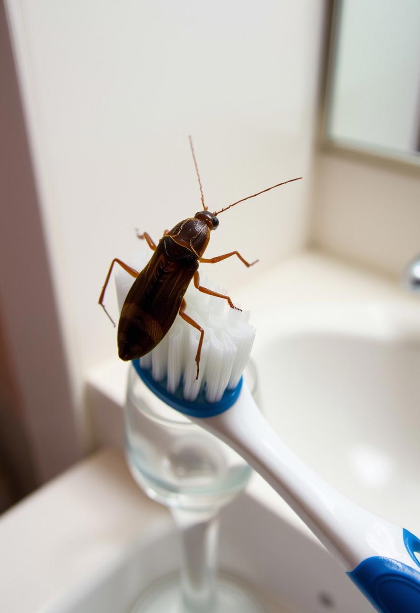 A roach sitting on the bristles of a toothbrush. The toothbrush is resting inside a glass that is sitting on the sink in the bathroom.