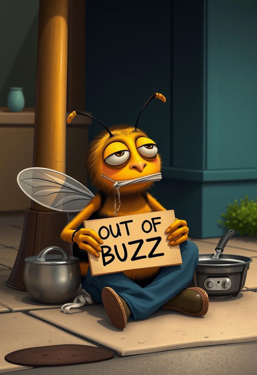 (((Pixar art style))) Homeless Bee sitting pan handling while sitting on sidewalk, holding sign that reads "OUT OF BUZZ", mouth is tied up,