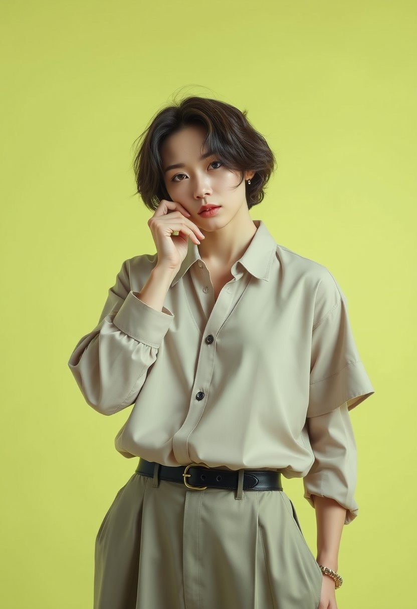 석고 피부와 상아색 백합으로 장﷿된 까마귀 머리카락을 한 성인 처녀가 풍화된 나무 노 젓는 배에 느긋하게 기대어 있습니다. 연꽃 잎의 푸른 캐노피를 통해 스며﷿는 햇살이 그녀를 고요한 빛으로 비추는 그녀의 가벼운 흰색 가운의 투명한 품질을 포착하세요. 그녀의 포즈는 이성적인 우아함을 발산해야 하며, 팔다리는 휴﷿과 고전적인 우아함을 모두 암﷿하는 방﷿으로 배열되어야 합니다. 신이 창조물을 바라보는 관점을 모방하여 높은 각도의 샷을 활용하세요. 처녀의 섬세한 아름다움과 배의 소박한 매력 사이의 대조를 강조하세요. 반﷿이는 하늘색 물과 ﷿﷿한 수련을 배경으로 합니다. 이미지는 ﷿프와 여신을 묘사한 고전적 그림을 연상﷿키는 고요한 평온함과 ﷿대를 초월한 아름다움을 불러일으켜야 합니다. 그녀 주위를 펄럭이는 무지개빛 날개를 가진 나비를 추가하여 그녀가 들고 있는 연꽃에 이끌려 장면의 영적인 분위기를 더욱 강화합니다. 상징주의적 명암 대비, 테네브리스트, 체적 조명, 미묘한 헐레이션, 고대비, 필름 그레인, 청록색과 주황색 색상 등급, 높은 ﷿적 범위, S-커브 감마