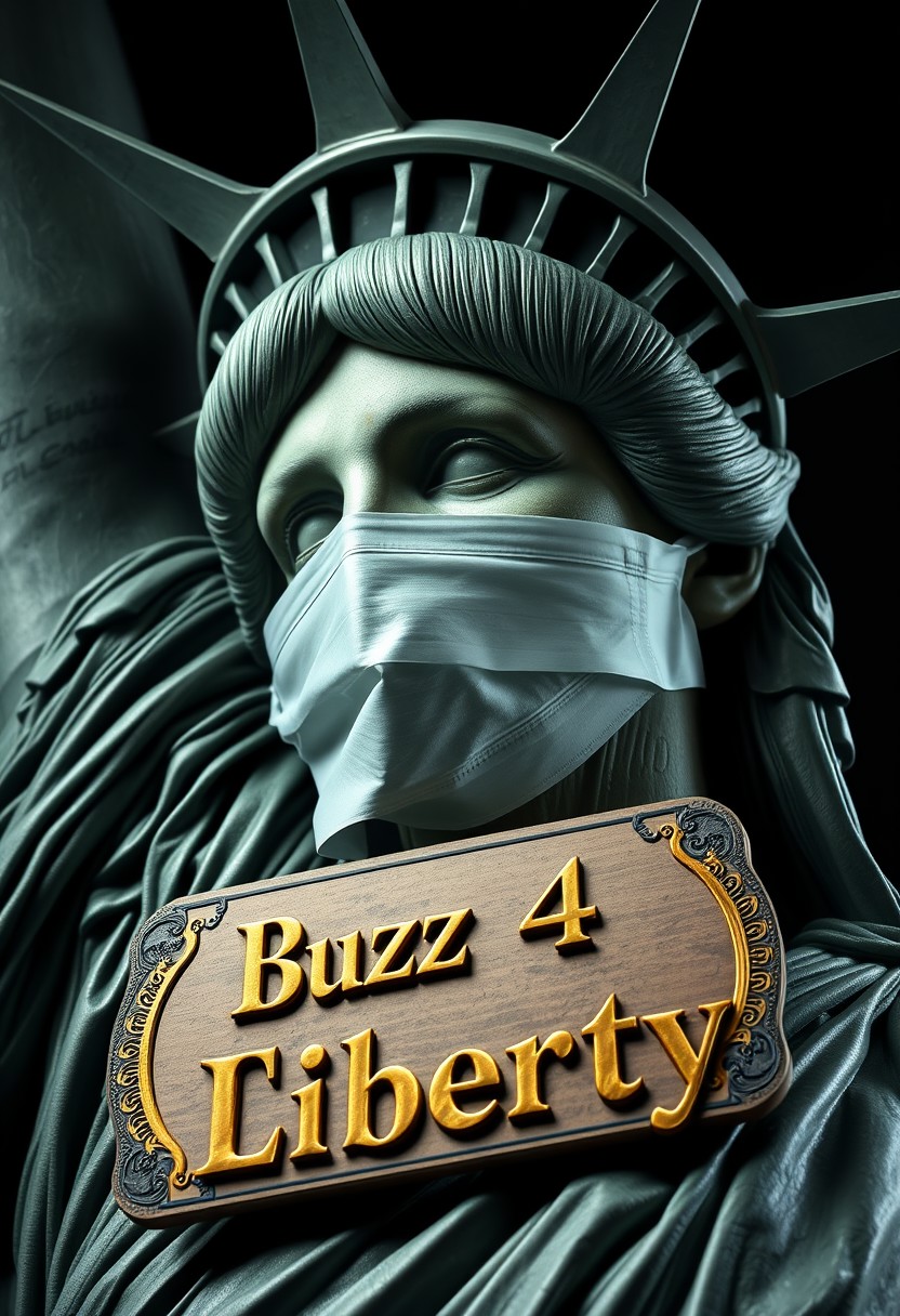 A highly detailed and dramatic portrait of the Statue of Liberty, focusing on her face in a macro close-up. The Statue of Liberty is unwrapping a large, non-surgical face mask, revealing the intricate and realistic facial muscle structure beneath. The mask is partially peeled away, exposing tendons, muscles, and sinews in high detail. Around her neck, a luxurious and ornate cardboard sign hangs with the text “Buzz 4 Liberty” elegantly embossed in gold lettering. The cardboard is richly decorated with intricate patterns and gilded edges, giving it an unexpectedly opulent appearance. The scene is lit with dramatic studio lighting, casting deep shadows and emphasizing the contrast between the statue’s iconic metal surface and the raw, exposed anatomy. The overall atmosphere is dark and unsettling, with a creepy, almost dystopian vibe that contrasts sharply with the rich, decorative sign.