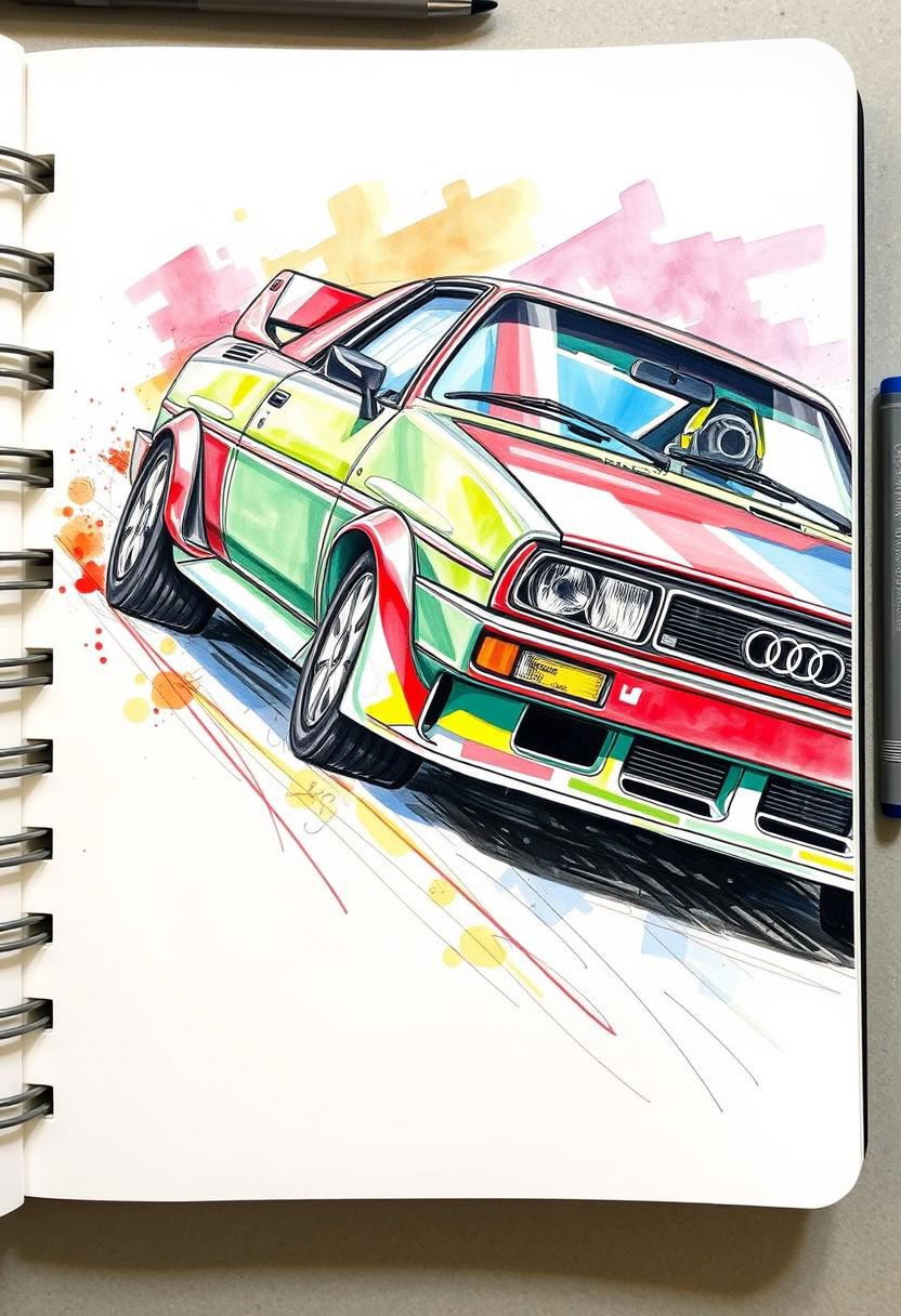 colorful sketch in pacenotes notebook showing Audi Quattro S1 taking a turn, aggressive angle, extremely detailed, masterpiece