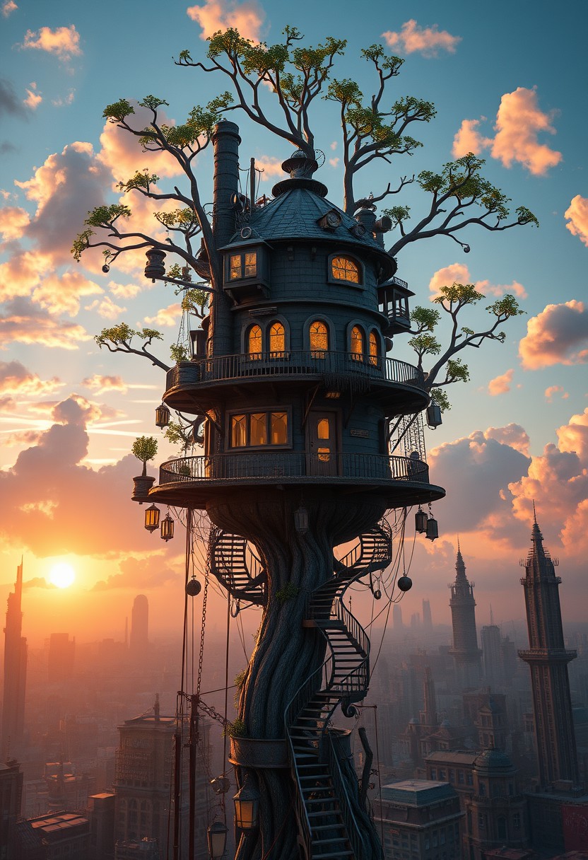steampunk treehouse in metal cityscape, lanterns, stairs, high in the sky, sundown, clouds, high above other buildings, Azulejo, ultrarealistic, world masterpiece, rule of thirds, hyperrealistic, super detailed, HDR, 8k, high quality, trending on artstation, pixiv, by Makoto Shinkai, by Hyung-tae Kim, by larry elmore, unreal engine 5