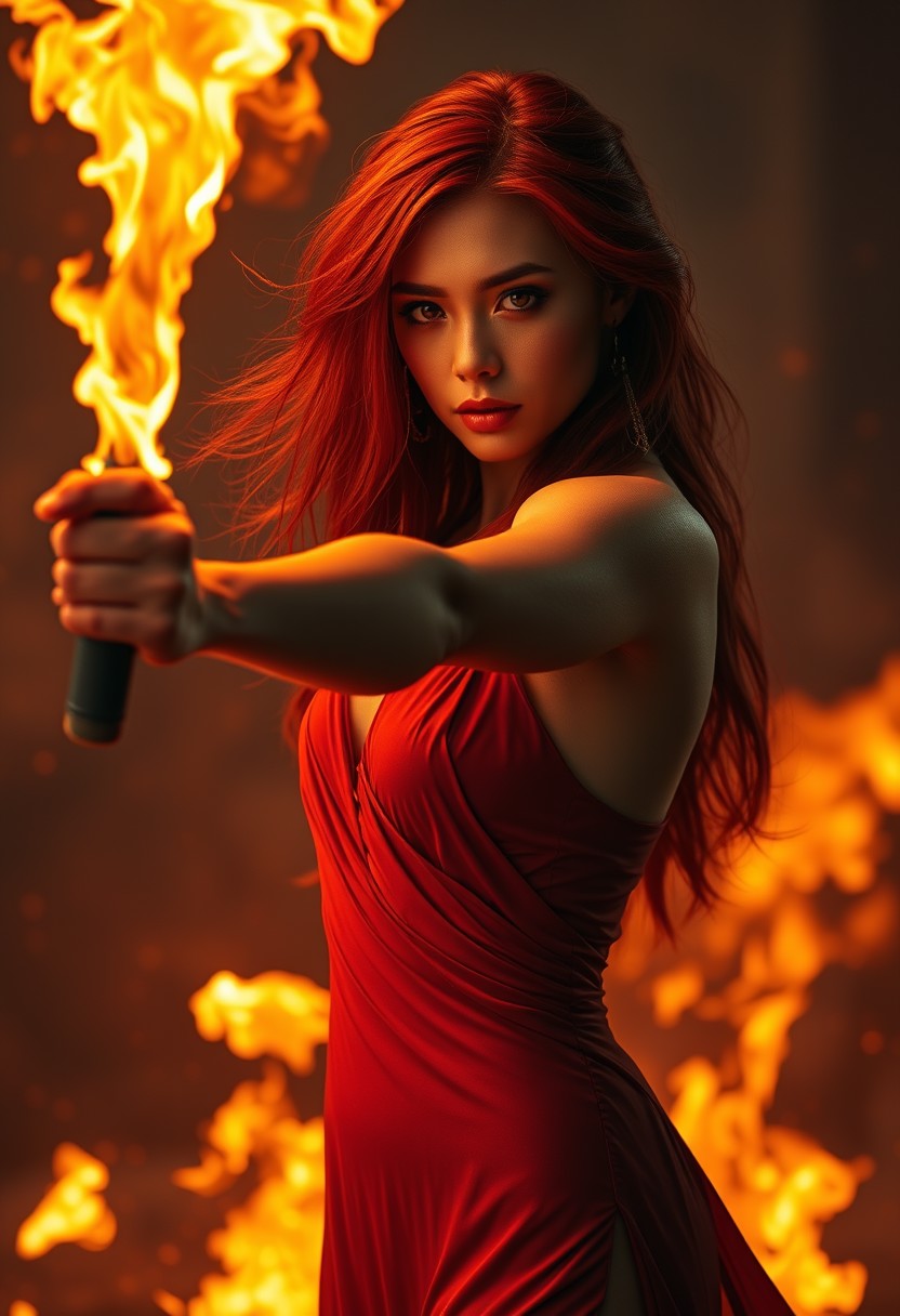 UHD 32k Epic Fantasy movie still, photograph, half-body portrait of fiery supermodel waiving fire wand wearing low-cut sleeveless dress, red hair, fire aura, correct digits, firestorm background, dynamic high action pose, sharp focus, studio photo, intricate details, highly detailed, sf, intricate artwork masterpiece, ominous, matte painting movie poster, golden ratio, trending on cgsociety, intricate, epic, trending on artstation, highly detailed, vibrant, production cinematic character render, ultra high quality model, close up portrait, film, studio lighting, detailed skin, ultra realistic, bokeh, sharp features