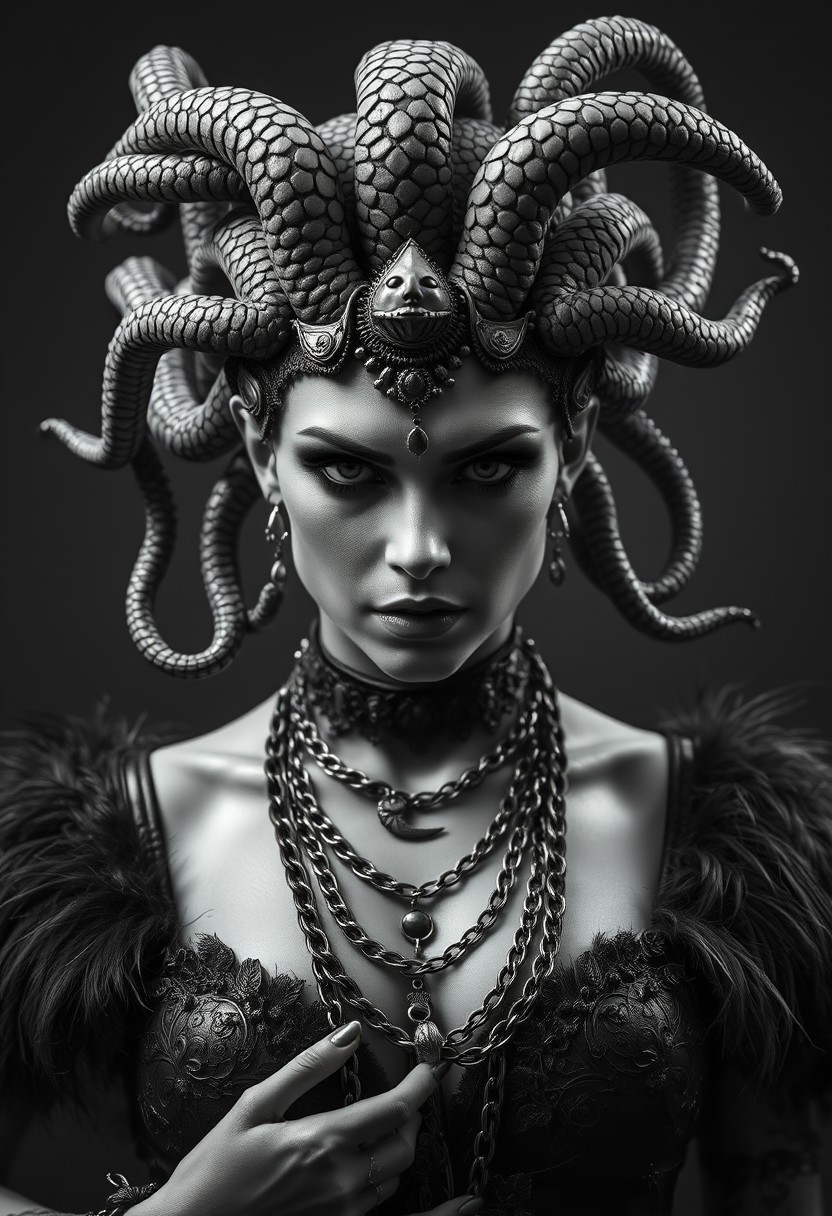 Close Up shot, front view of Medusa, lust look, erotic, hot, beautiful, snakes, chains necklaces, feathers pauldron, fur cape, hyper realistic, ultra detailed black and white Photography studio style