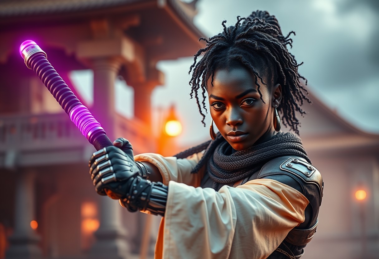 (A cinematic shot of a beautiful african cyborg, detailed face features, curly hair, one prosthetic arm, holding a purple glowing mace by the handle in defensive pose, orange haze around the katana blade, best quality, amazing details, temple in background:1.2)