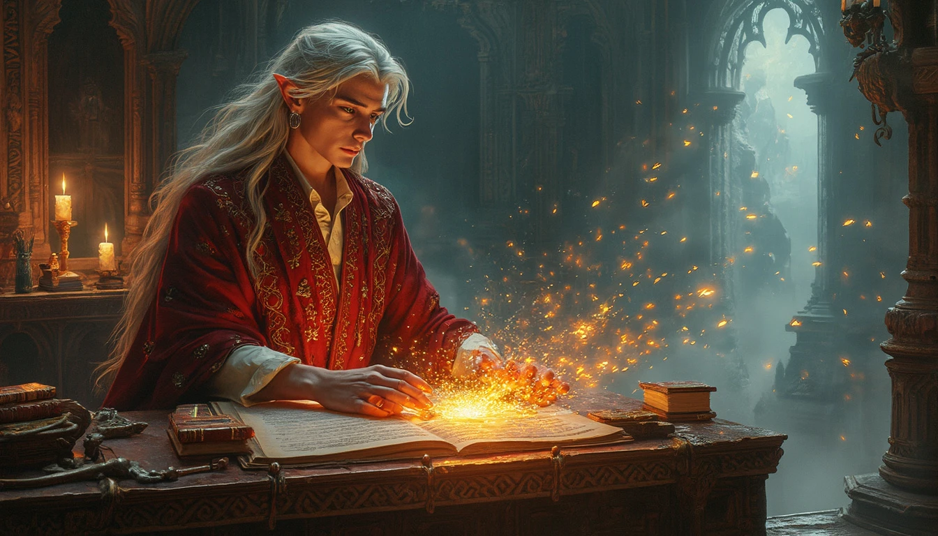 In the shadowy interior of a towering, gothic-style mage tower, Fildor Azaghal, a captivating elven magician, stands confidently amidst an array of mystical artifacts. His flowing robe, a deep crimson adorned with intricate golden patterns, shimmers faintly in the soft glow of magical luminescence that dances around the room. With his silver hair cascading gently to his shoulders, a single radiant golden streak frames his chiseled face, accentuating his striking emerald eyes that glimmer with enigmatic wisdom. The air crackles with the palpable energy of impending magic, as small flickers of flame leap playfully from his fingertips, illuminating the ancient tomes and scrolls scattered across an intricately carved wooden table. Each book is bound in richly colored leather, filled with arcane symbols and esoteric knowledge reflecting centuries of potion-making and alchemical secrets. Beside him, a small fire elemental companion, no larger than a sparrow, flares to life, its bright orange and yellow hues swirling in a miniature dance, casting whimsical shadows around the dimly lit chamber. Its playful spirit mirrors Fildor's discreet yet charismatic demeanor, as he prepares to open a swirling portal that shimmers like a mirage, leading to the fiery realm of the Elemental Plane of Fire. Outside, storm clouds gather, the sky darkening ominously, contrasting sharply with the luminous, fiery energy emanating from the tower's summit. The atmosphere is thick with anticipation—magic hangs in the air, charged with the promise of adventure and the thrill of the unknown. Fildor grips a beautifully engraved staff, topped with a glowing ruby, which pulses in time with the rhythm of his heartbeat—a true maestro of fire magic, poised on the brink of an epic journey into fantastical realms beyond mortal comprehension. Intricate details, by Luis Royo, Greg Rutkowski.