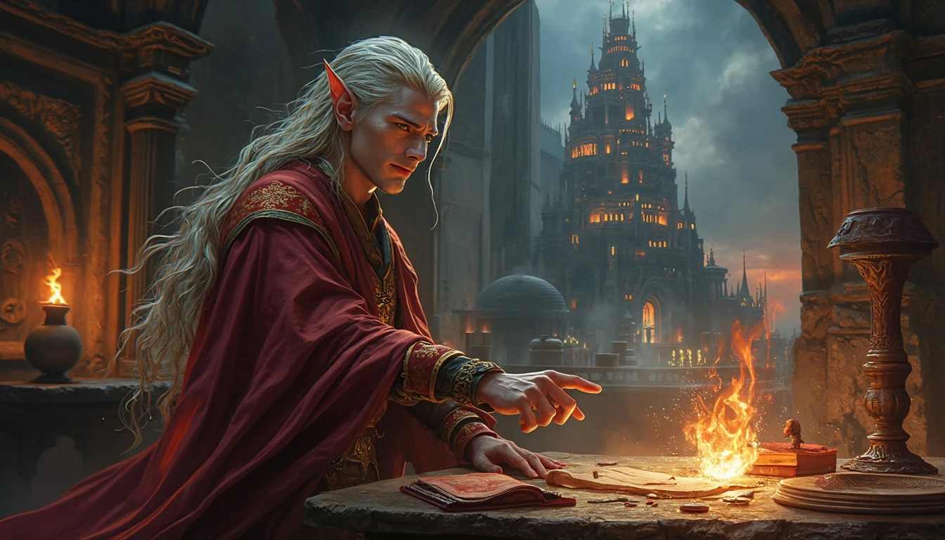 In the shadowy interior of a towering, gothic-style mage tower, Fildor Azaghal, a captivating elven magician, stands confidently amidst an array of mystical artifacts. His flowing robe, a deep crimson adorned with intricate golden patterns, shimmers faintly in the soft glow of magical luminescence that dances around the room. With his silver hair cascading gently to his shoulders, a single radiant golden streak frames his chiseled face, accentuating his striking emerald eyes that glimmer with enigmatic wisdom. The air crackles with the palpable energy of impending magic, as small flickers of flame leap playfully from his fingertips, illuminating the ancient tomes and scrolls scattered across an intricately carved wooden table. Each book is bound in richly colored leather, filled with arcane symbols and esoteric knowledge reflecting centuries of potion-making and alchemical secrets. Beside him, a small fire elemental companion, no larger than a sparrow, flares to life, its bright orange and yellow hues swirling in a miniature dance, casting whimsical shadows around the dimly lit chamber. Its playful spirit mirrors Fildor's discreet yet charismatic demeanor, as he prepares to open a swirling portal that shimmers like a mirage, leading to the fiery realm of the Elemental Plane of Fire. Outside, storm clouds gather, the sky darkening ominously, contrasting sharply with the luminous, fiery energy emanating from the tower's summit. The atmosphere is thick with anticipation—magic hangs in the air, charged with the promise of adventure and the thrill of the unknown. Fildor grips a beautifully engraved staff, topped with a glowing ruby, which pulses in time with the rhythm of his heartbeat—a true maestro of fire magic, poised on the brink of an epic journey into fantastical realms beyond mortal comprehension. Intricate details. Drawing inspiration from the heroes of a 70’s epic heroic fantasy art style reminiscent of artists such as Clyde Caldwell, Keith Parkinson, Boris Vallejo, Jeff Easley, Luis Royo, and Greg Rutkowski, who burst forth through the canvas with epic tales of bravery, magic, and adventure waiting to unfold.
