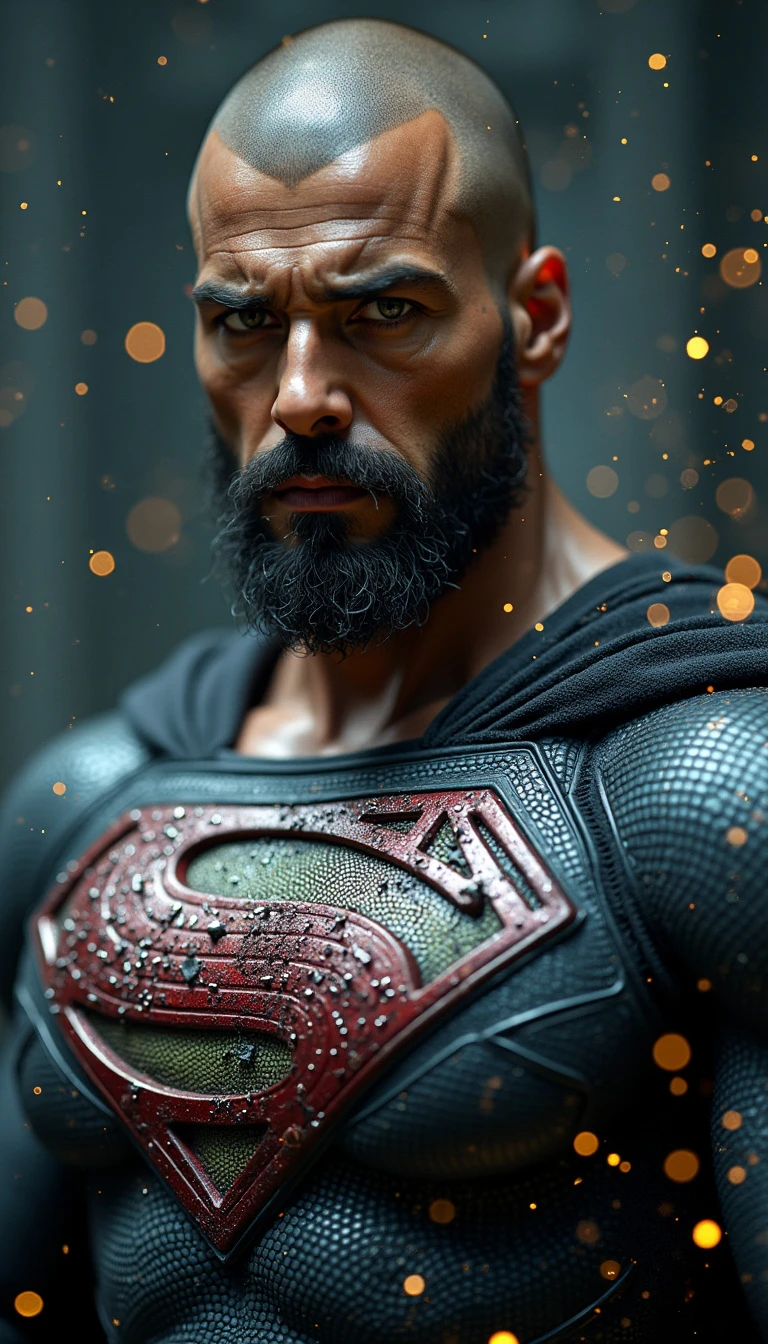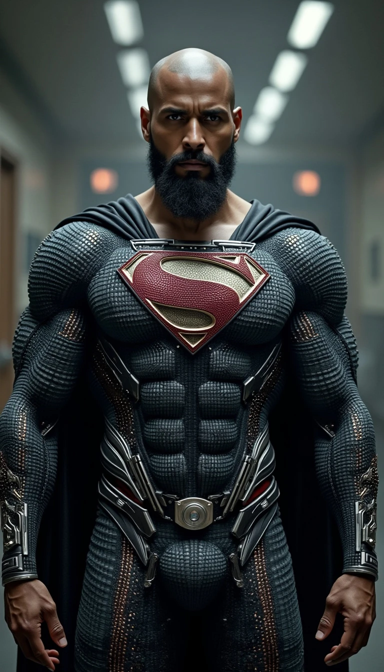 A dark brown-skinned Superman, dressed in a sleek, capless black suit, undergoing healing through advanced nanotechnology. His clean-shaven head and full beard add to his powerful, commanding presence as he faces the viewer. Ultra-realistic visual effects show intricate nanobots in action, repairing his wounds and restoring his strength, with metallic particles swirling around his body. His expression is intense, and the scene is rich with detail, emphasizing his resilience and the cutting-edge technology at work.