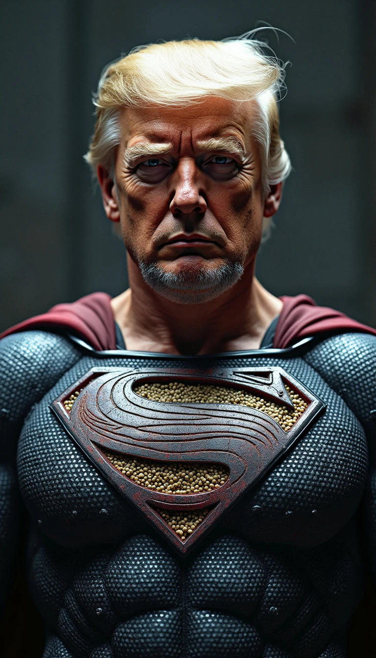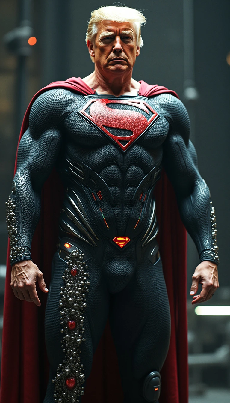 President Donald Trump as Superman, dressed in a sleek, capless black suit, undergoing healing through advanced nanotechnology. His clean-shaven head and full beard add to his powerful, commanding presence as he faces the viewer. Ultra-realistic visual effects show intricate nanobots in action, repairing his wounds and restoring his strength, with metallic particles swirling around his body. His expression is intense, and the scene is rich with detail, emphasizing his resilience and the cutting-edge technology at work.