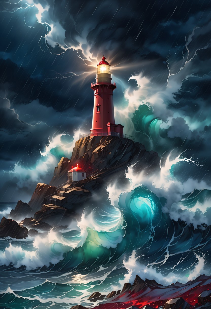 Red theme, alcohol ink of majestic luminous lighthouse perched on rocky cliff, night, rain, powerful beam of dramatic spotlight, stormy night, tumultuous ocean background, focus colours navy and brown, subtle colours, swirling waves crash against the lighthouse base, dark clouds, transparent waves, brooding sea in darkness. heavy rain, rough sea, hyperdetailed, dramatic,