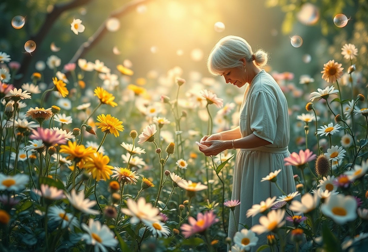 Memory Gardener: A caretaker of a garden where each flower represents a different memory. The Memory Gardener tends to the flowers, pruning some, nurturing others, and occasionally planting new seeds. The garden is filled with ethereal light, with memories floating as soft, glowing petals.