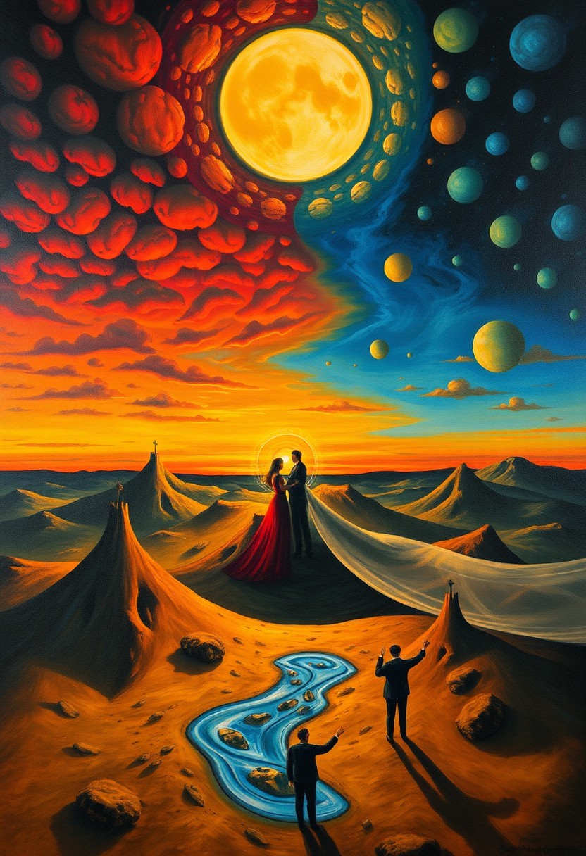 original painting by Salvador Dali "the permanence of memory", oil on canvas, Fantastically beautiful, high resolution, mesmerizing, sunset, dawn, wide color palette, magnificent people, beautiful animals, masterpiece, nature, ultra detail