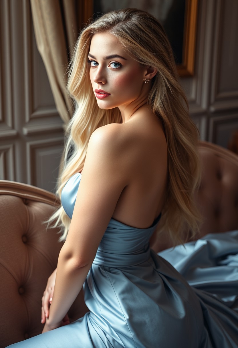 Masterpiece, Portrait of a sexy debutante, highly detailed, best quality, beautiful face profile, full lips, closed mouth, HairDetail, long flowing blonde hair, pale white alabaster skin, arched back, romantic parlor, silk sky blue evening gown, huge breasts, sideboob, slender body, tiny waist, defined abs, curvy hips, round ass, simple jewelry, laying seductively on an upholstered chaise lounge, sensual dim lighting, hidden hands, eye contact, lustful blue eyes