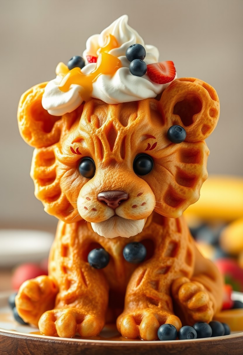"Create a whimsical and realistic digital artwork featuring an adorable lion cub made entirely from fluffy, golden-brown waffles. The waffle cub should be rendered in exquisite detail, with visible texture and subtle shading that captures the crispy edges and soft centers of the waffles. The cub's body should be embedded with an assortment of different breakfast fruits, such as juicy blueberries, plump strawberries, and sweet bananas. Whipped cream should adorn the top of the cub's head, topped with a variety of breakfast fruits and a drizzle of maple syrup. The whipped cream should be rendered in intricate detail, with visible peaks and swirls that capture the light. The overall effect should be one of enchanting realism, as if the viewer could reach out and touch the soft, fluffy waffles and taste the sweetness of the whipped cream and fruit." Highest-Quality, 4k, intricate details, visually stunning, Masterpiece