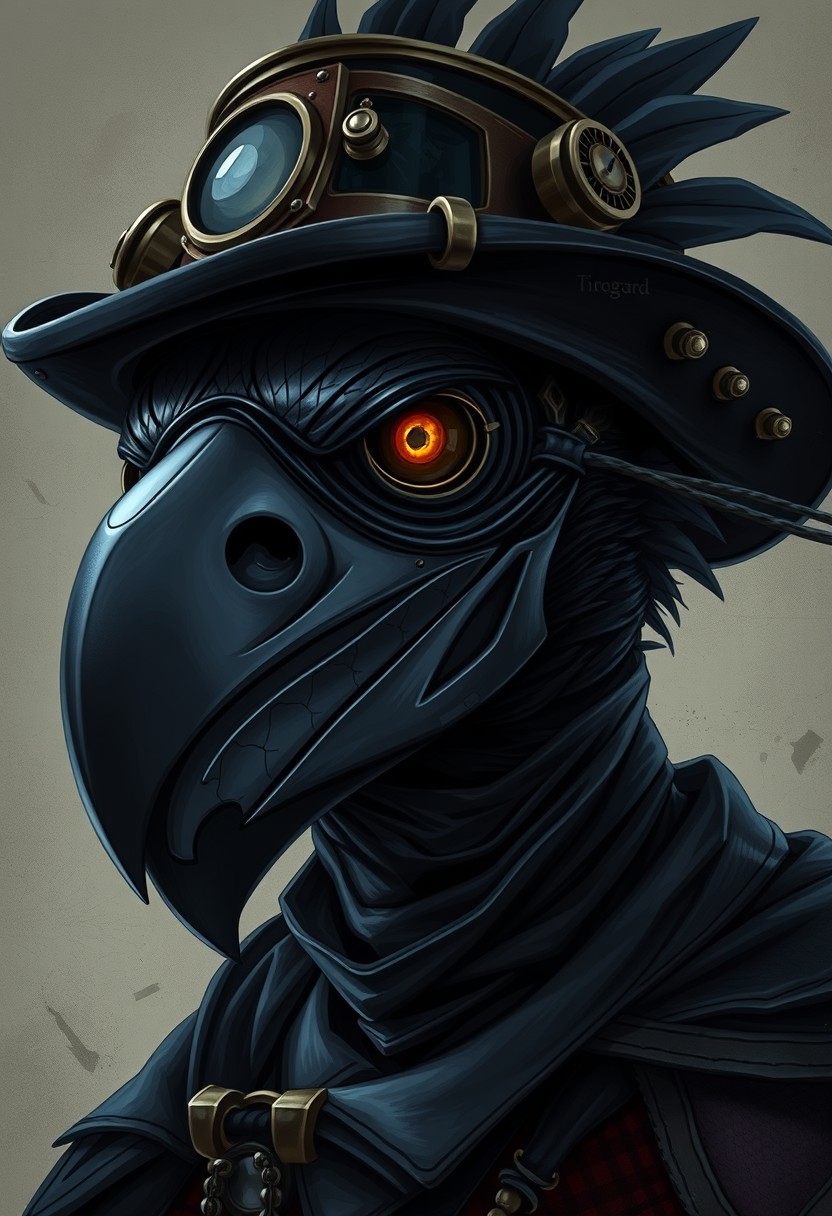 steampunk anthropomorphic crow, black plague mask, Artstation illustrators, intricate details, face, full body portrait, dim light, illustration, UHD, 4K