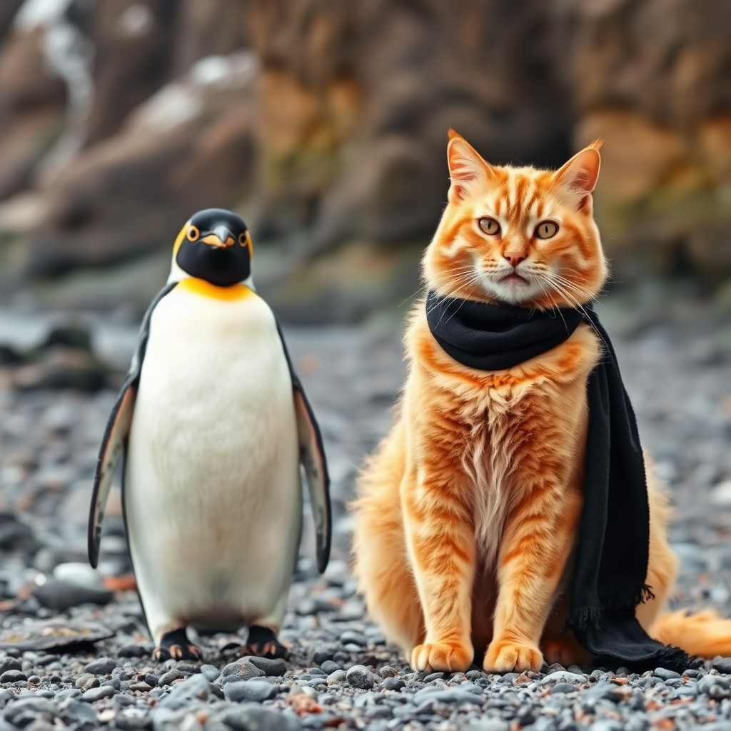a large ginger cat wearing a black scarf, sits with a smile on his face next to a penguin as they have their photograph taken, rocky beach, cliffs, cold climate