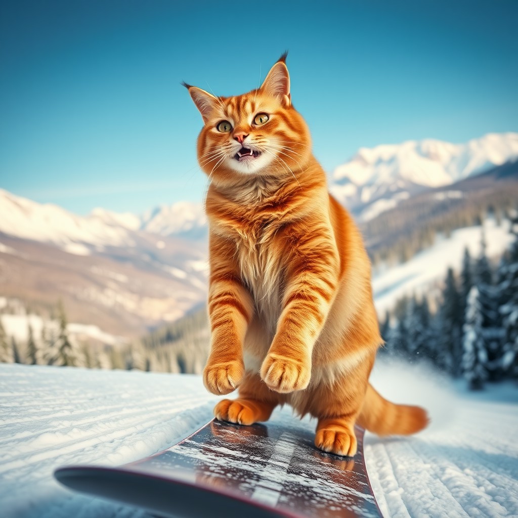 a large ginger cat, stood with his paws tightly gripping a snowboard, a look of exhilaration on his face, slides down a beautiful alpine slope, forests, mountains, blue sky, a brightly lit scene