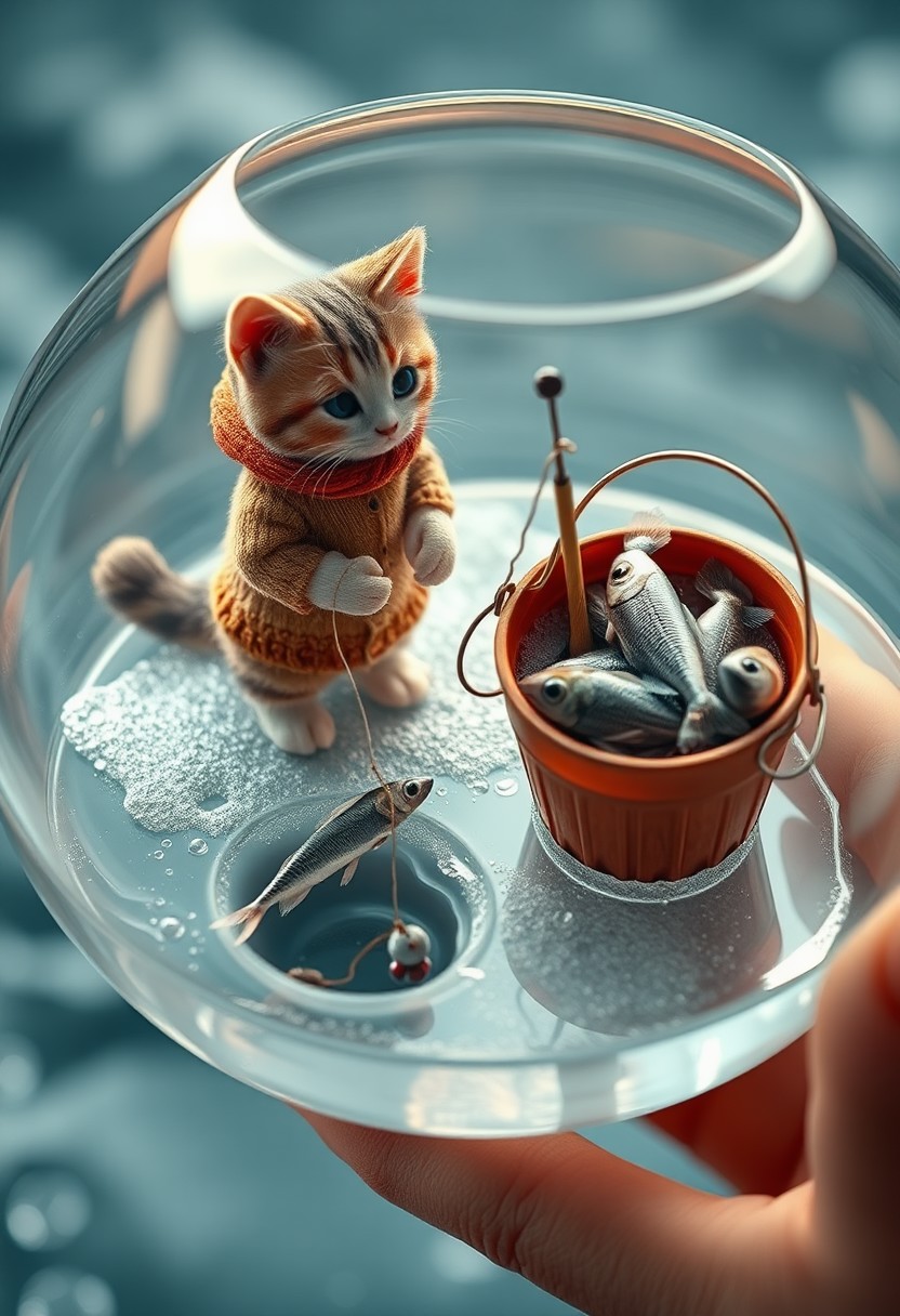 "Create a whimsical and realistic digital artwork featuring a miniature scene of an adorable cat dressed in warm winter clothing, standing on a thin layer of ice with the water visible from below. The cat should be rendered in exquisite detail, with visible texture and subtle shading that captures the softness of its fur and the warmth of its winter clothing. The ice should be transparent, with visible ripples and bubbles that capture the movement of the water beneath. The bucket filled with freshly caught small fish should be next to the cat, with each fish rendered in intricate detail, complete with scales and fins. The cat should be standing in front of a small hole drilled in the ice, with its line and bait visible beneath the surface. Unbeknownst to the cat, a singular terrifying monster fish should be lurking in the deep, with long needle-like teeth and a menacing gaze fixed on the bait. The overall effect should be one of enchanting realism, as if the viewer could reach out and touch the clear bowl and feel the chill of the ice. The scene should be viewed from the side of the bowl, with a great view of everything going on in the miniature world." Highest-Quality, 4k, intricate details, visually stunning, Masterpiece