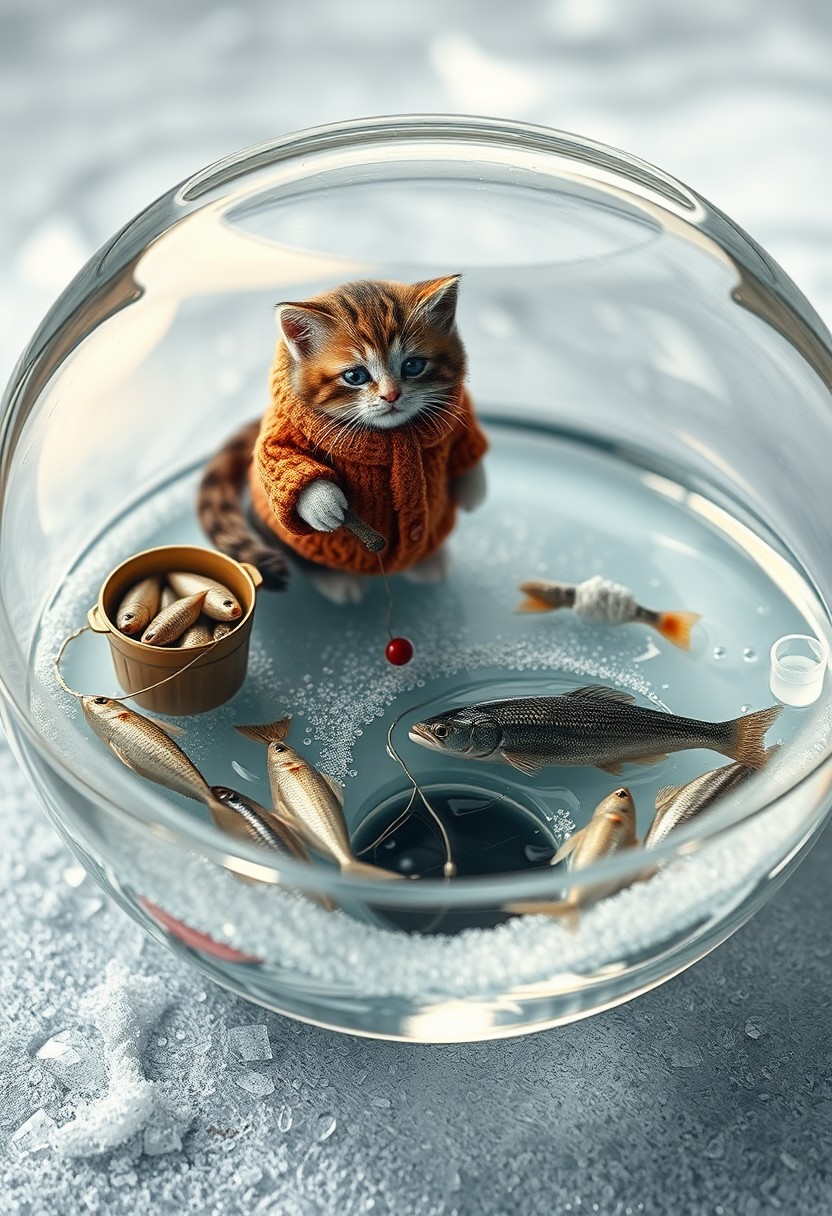 "Create a whimsical and realistic digital artwork featuring a miniature scene of an adorable cat dressed in warm winter clothing, standing on a thin layer of ice with the water visible from below. The cat should be rendered in exquisite detail, with visible texture and subtle shading that captures the softness of its fur and the warmth of its winter clothing. The ice should be transparent, with visible ripples and bubbles that capture the movement of the water beneath. The bucket filled with freshly caught small fish should be next to the cat, with each fish rendered in intricate detail, complete with scales and fins. The cat should be standing in front of a small hole drilled in the ice, with its line and bait visible beneath the surface. Unbeknownst to the cat, a singular terrifying monster fish should be lurking in the deep, with long needle-like teeth and a menacing gaze fixed on the bait. The overall effect should be one of enchanting realism, as if the viewer could reach out and touch the clear bowl and feel the chill of the ice. The scene should be viewed from the side of the bowl, with a great view of everything going on in the miniature world." Highest-Quality, 4k, intricate details, visually stunning, Masterpiece