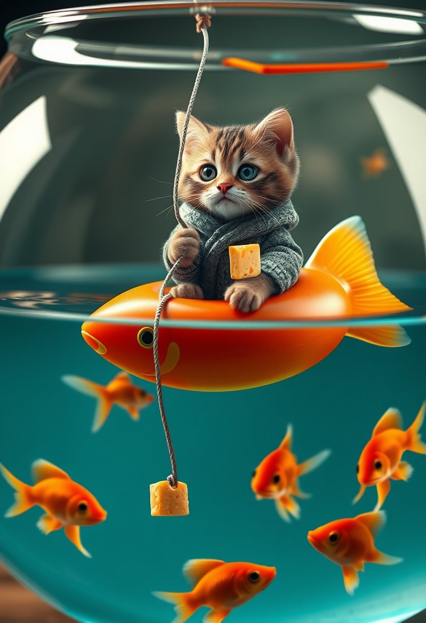 "Create a whimsical and realistic digital artwork featuring a miniature scene of an adorable cat dressed in fisherman clothing, sitting on a fish-shaped inner tube floating on the surface of the water in a large fishbowl. The cat should be tiny in comparison to the fishbowl, with a sense of vulnerability and determination. The cat should be holding a long piece of string, with a piece of cheese tied to the end as bait, under the water. The string should be rendered in intricate detail, with visible texture and subtle shading that captures the delicate fibers and threads. The cheese should be depicted as a tantalizing treat, with a subtle sheen and texture that captures its creamy surface. The goldfish should be swimming around the bowl, with intricate details that capture their scales, fins, and movements. The fish-shaped inner tube should be rendered in bright, vibrant colors, with a smooth, rubbery texture that captures its inflatable surface. The overall effect should be one of enchanting realism, as if the viewer could reach out and touch the fishbowl and feel the excitement of the cat's fishing adventure." Highest-Quality, 4k, intricate details, visually stunning, Masterpiece