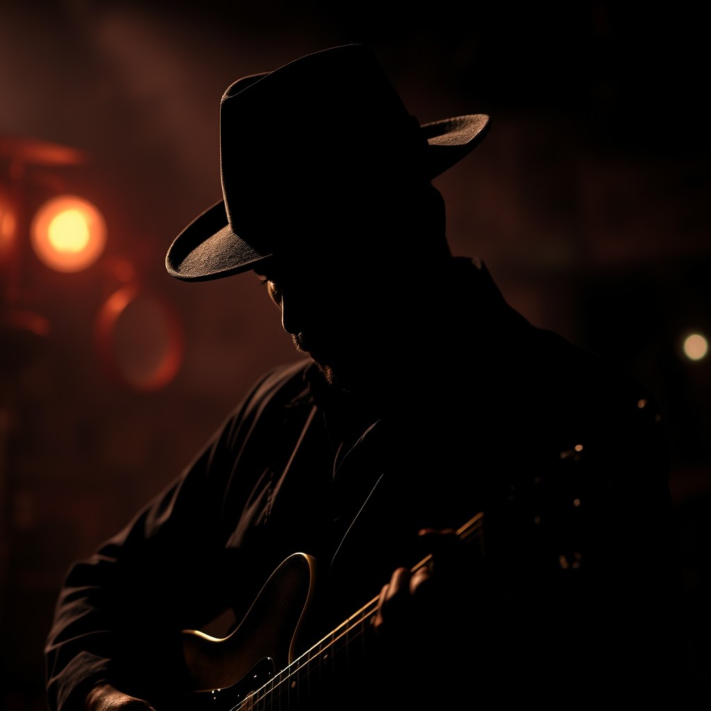 Atmospheric photograph of the silhouette of a blues guitarist wearing a fedora, in a smokey bar, high contrast, shadows, creative masterpiece, vintage and worn look