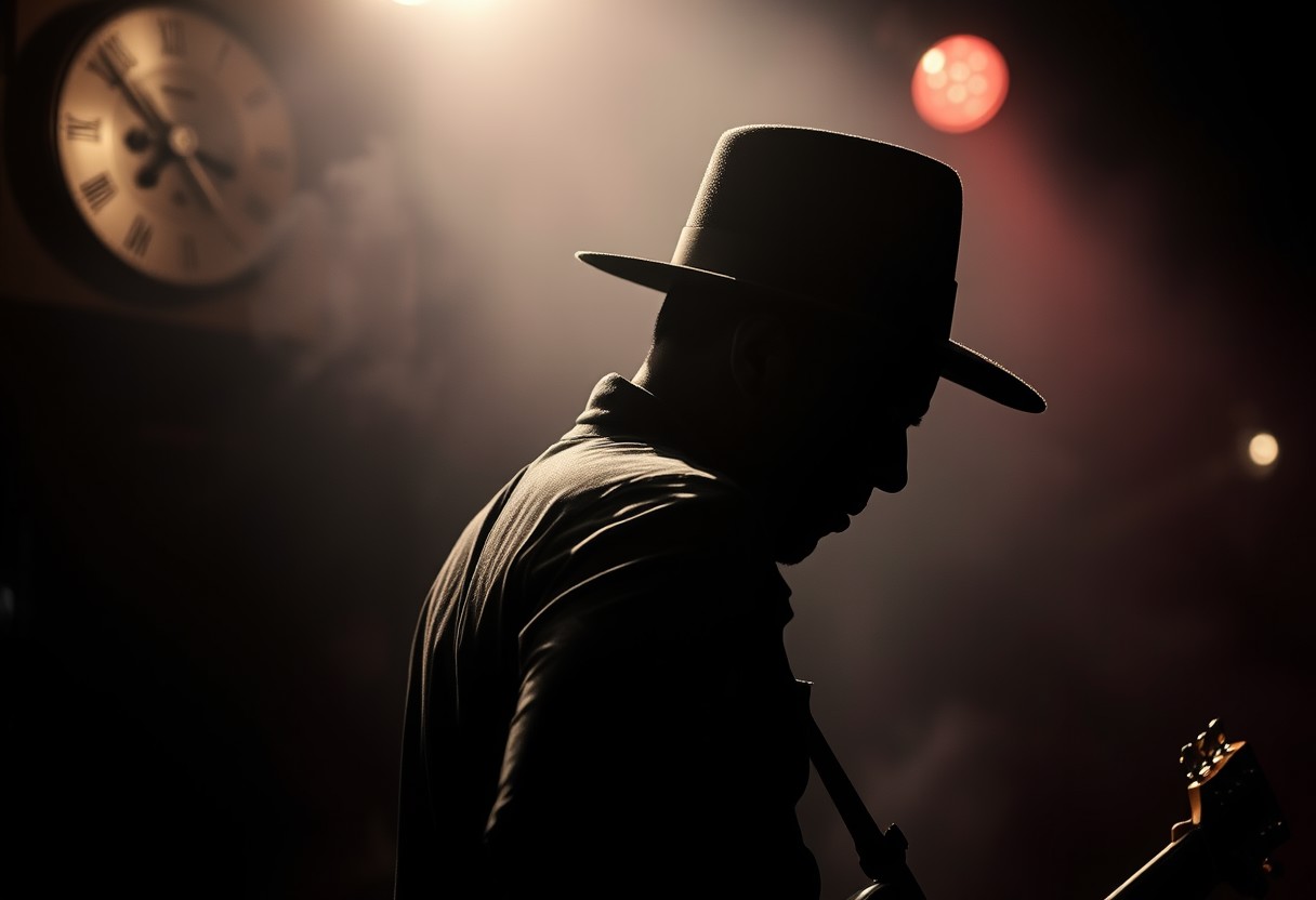 Atmospheric photograph of the silhouette of a blues guitarist wearing a fedora, in a smokey bar, high contrast, shadows, creative masterpiece, vintage and worn look